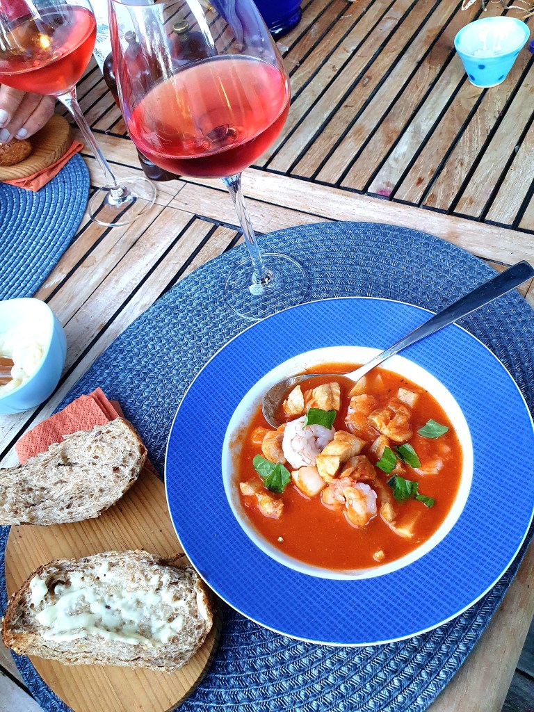 Rekene ble tilsatt kalde rett i tallerken. Suppa ble servert med grovt brød og hjemmelaget aioli. GODT…