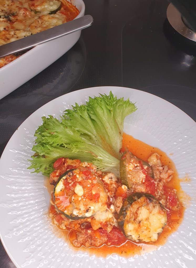 Dette er ingen ordentlig lasagna ettersom lasagna betyr pastaplate og også betegner en italiensk rett hvor man legger pastaplatene lagvis med tomatsaus og en hvit saus. I «lasagnaen» her er pastaplatene erstattet med skiver av squash og den hvite sausen med hytteost blandet med melk. Det er også brukt kyllingkjøttdeig i tomatsausen istedenfor kjøttdeig fra okse. Dette gir en mye lettere rett som har mange av de samme smakene som tradisjonell lasagna. Vil du prøve, anbefaler jeg en ovnsfast form som er mindre enn den jeg har brukt her (ca 20×28 cm).