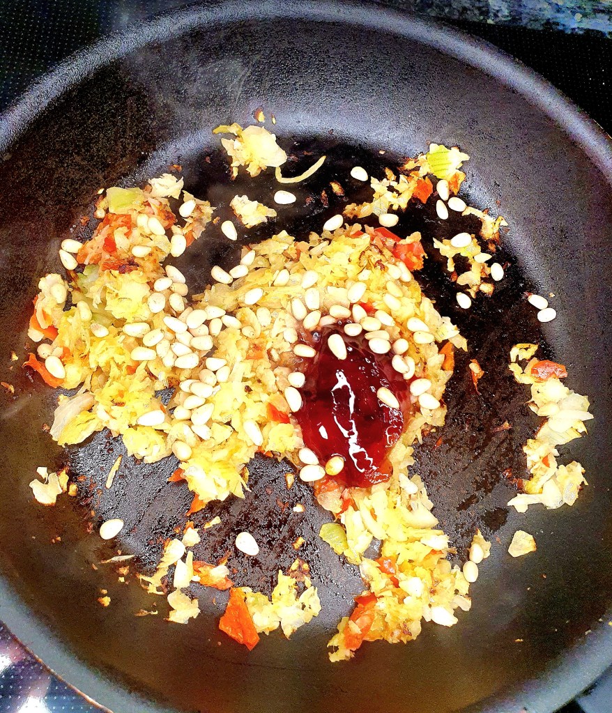 Løk, hvitløk og chili ble stekt i olje under røring til det begynte å lukte. Tilsatte ripsgeleen og pinjekjernene og stekte videre under røring til løken hadde fått en gyllen farge. Rørte inn krydderne og smakte til med litt salt og grov pepper. Blandingen ble overført til en bolle og avkjølt.