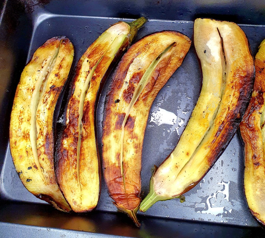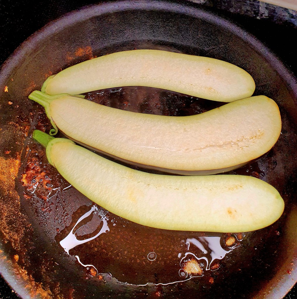 Auberginene ble delt i to på langs med stilken på. De ble stekt i olje i pannen på begge sider til de var myke inni- dette tar ca 5-6 minutter, alt etter størrelsen.