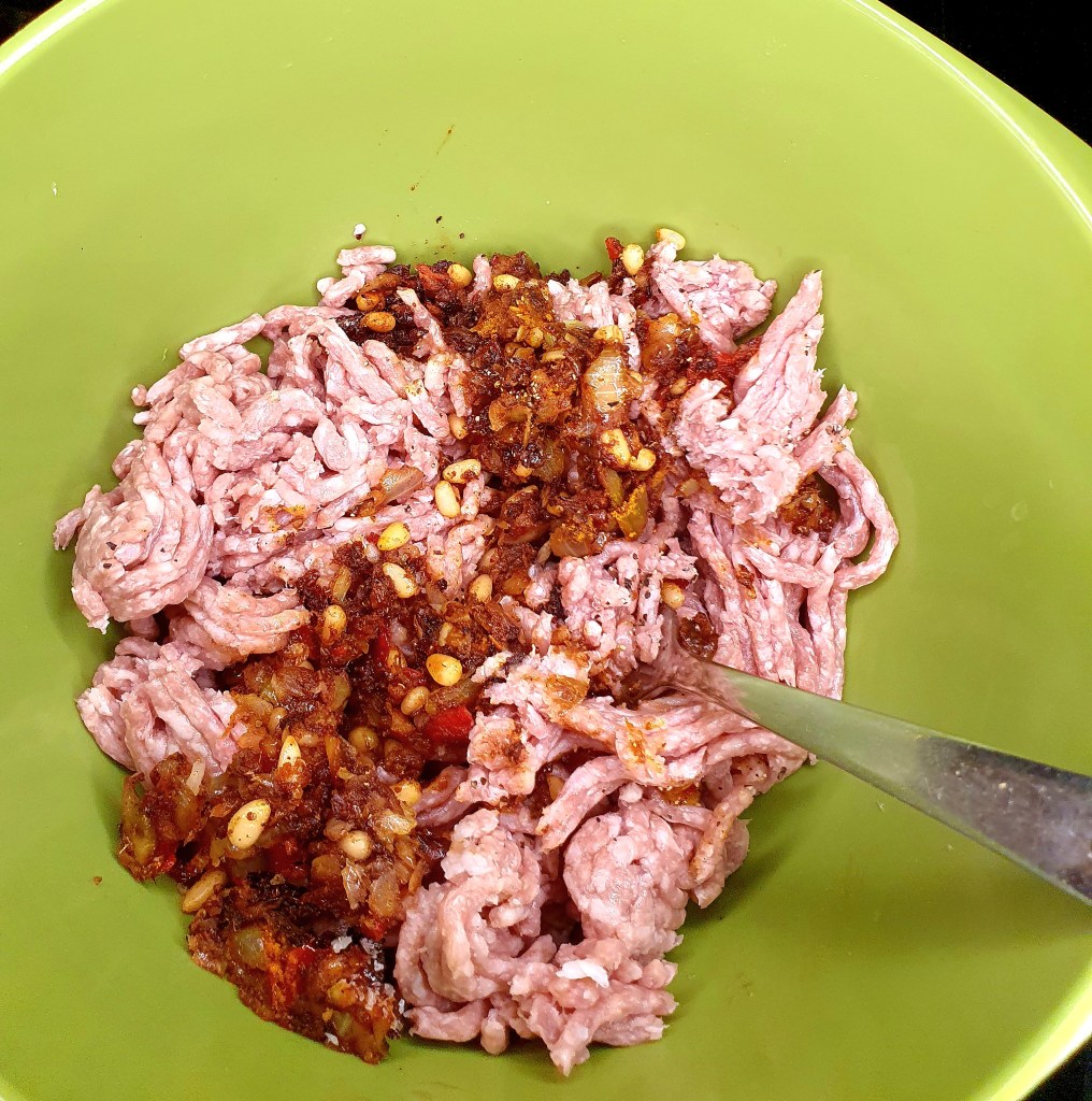 Imens ble løkblandingen blandet inn i kjøttdeigen, bruk gjerne hendene.