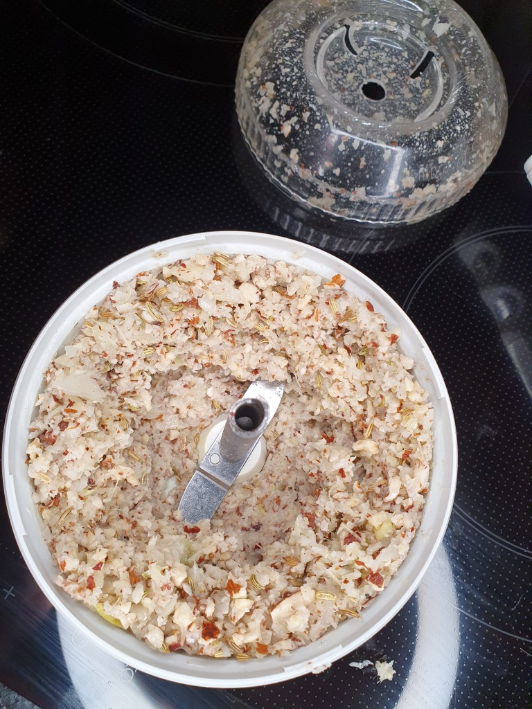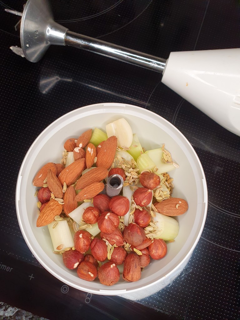 Nøttene og hvitløken ble finhakket i en liten foodprosessor (eller du kan finhakke dem for hånd og etterpå støte dem i en morter).
