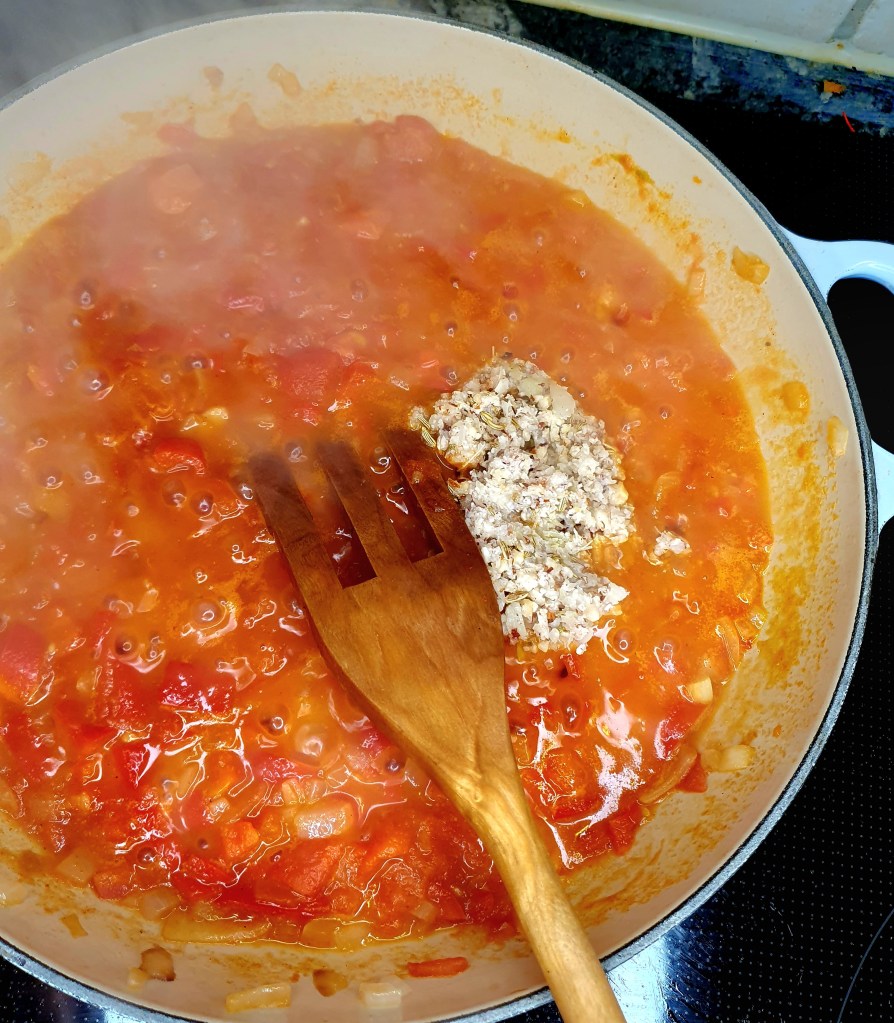 Løken ble stekt i litt olje til den ble blank. Tilsatte så hvitløk, chili, tomater og fennikelfrø. Kokte opp under omrøring og tilsatte deretter vinen og kokte opp igjen slik at alkoholen fordampet. Tilsatte en dasj cognac og kraften. Kokte opp enda en gang og tilsatte litt av nøtteblandingen. Rørte godt og kokte litt inn. Tilsatte mer nøtteblanding og kokte inn til konsistensen var som en middels tykk saus.
