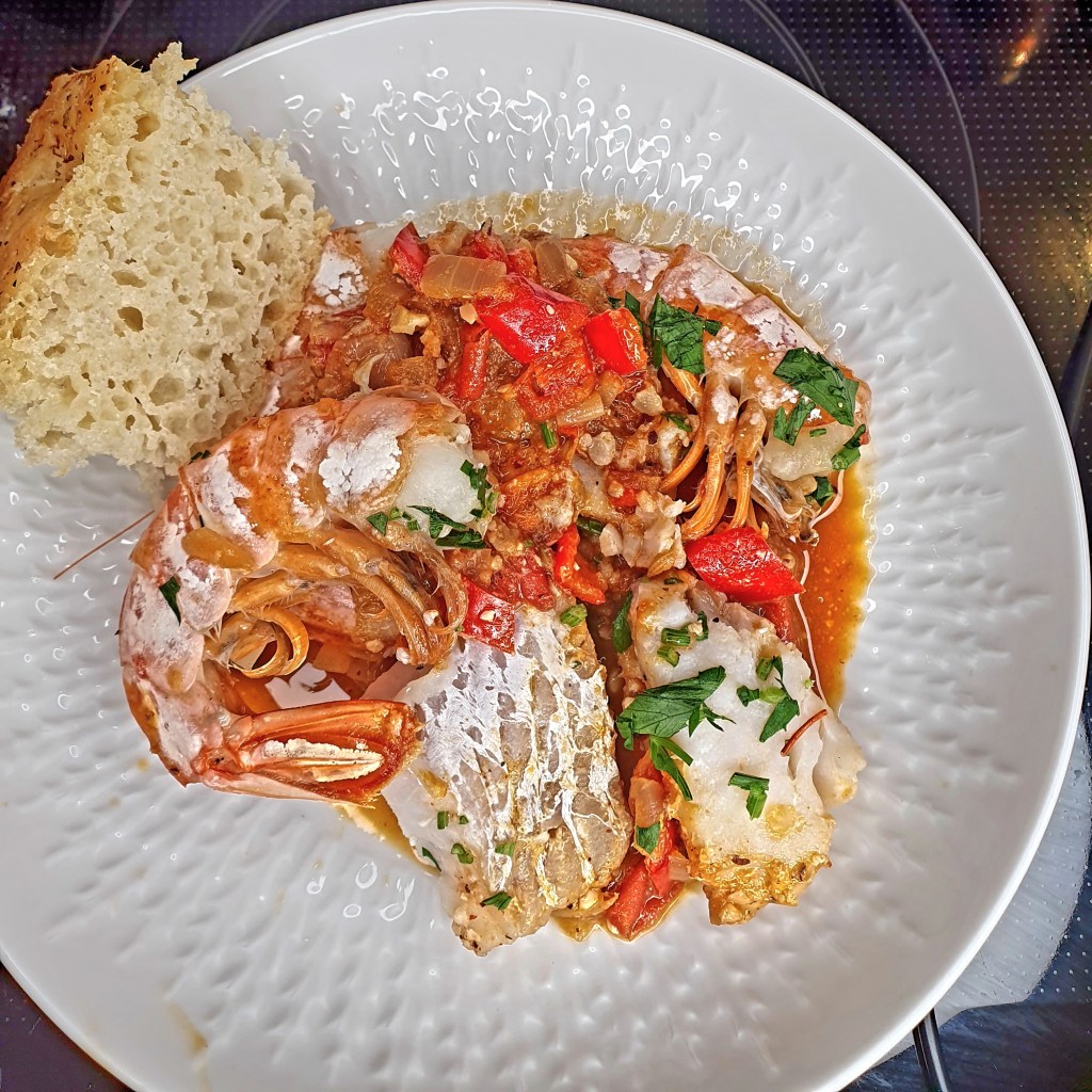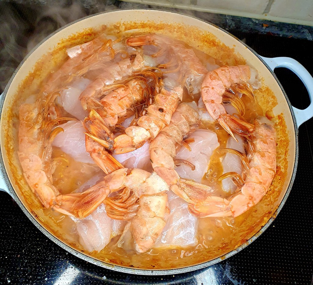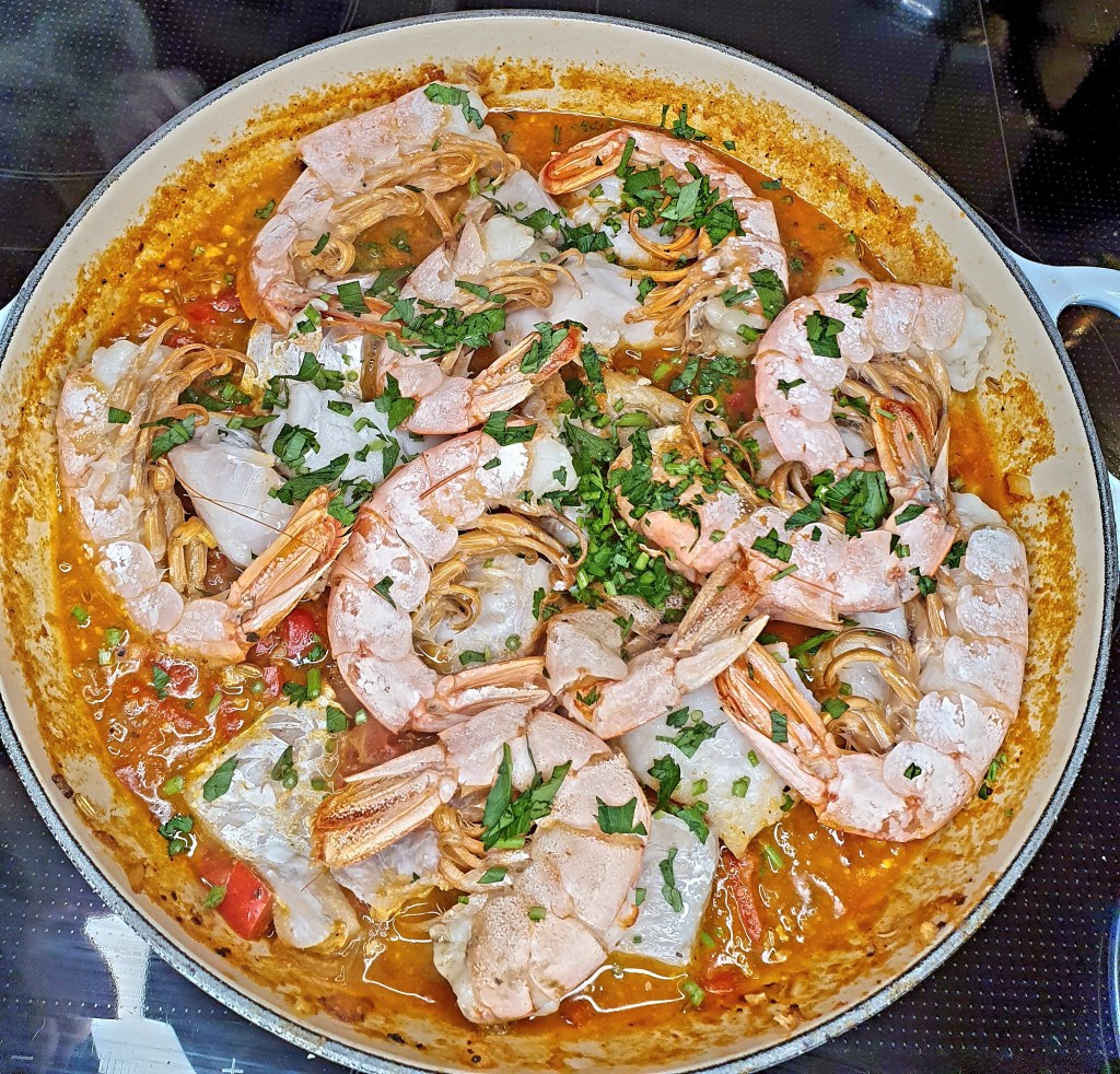 Denne retten kommer fra Katalonia i Spania og kalles Zarzuela. Jeg ble først kjent med den gjennom en krimroman av Thore Hansen som utspiller seg i den lille byen Cadaquez. Du kan i grunnen bruke hva som helst av fisk og sjømat her, jeg hadde tilgjengelig store rå reker og lyr. Blåskjell eller andre muslinger er også utrolig godt hvis du har det. Sausen er det som tar mest tid å lage og der lønner det seg å ha god kraft, gjerne skalldyrkraft, for å få den gode dype smaken. Sausen jevnes med malte nøtter. Advarsel: dette smaker innmari godt og gir lykkefølelse…