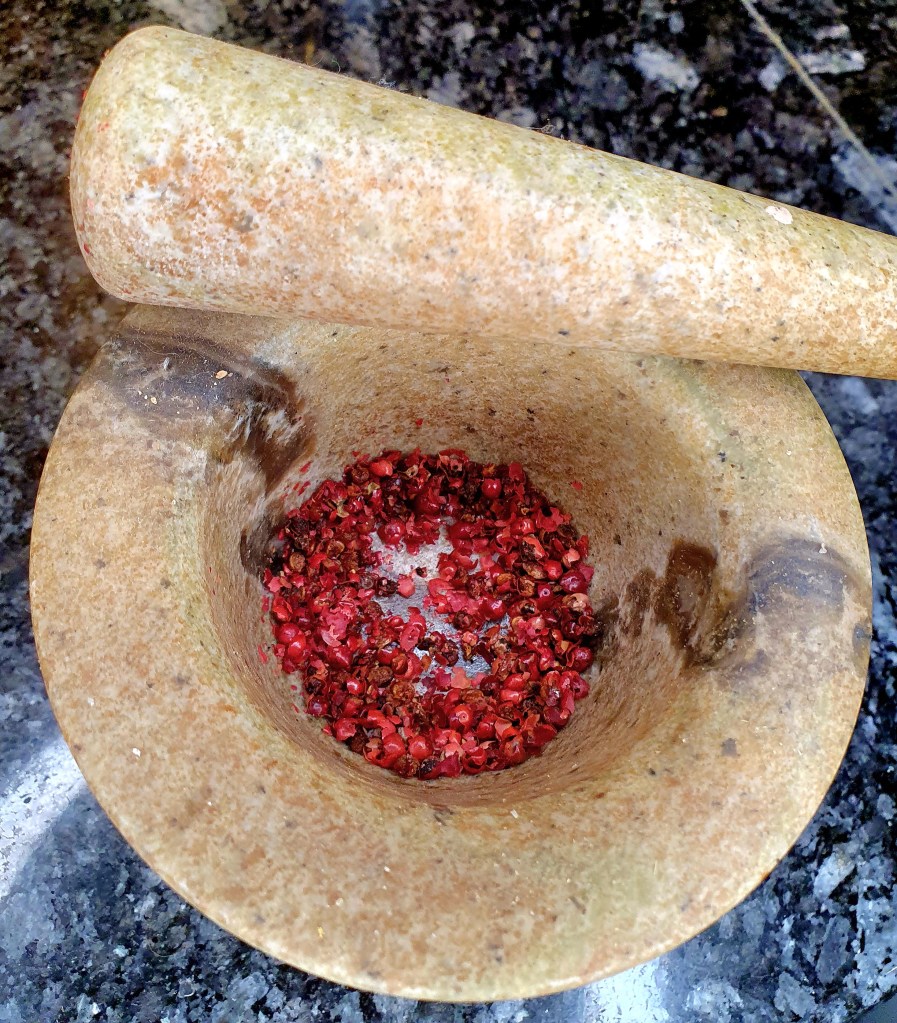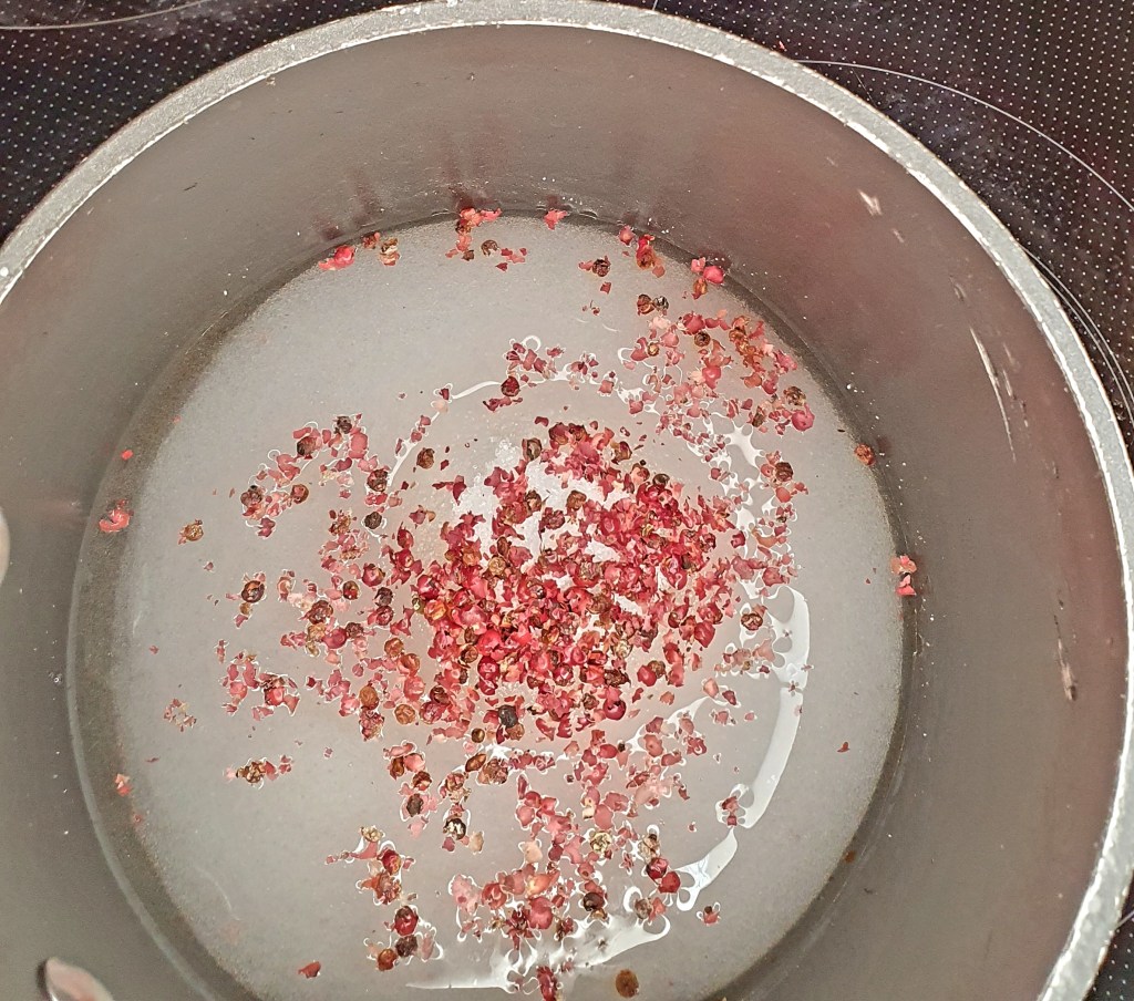 Rosèpepper kommer fra rosèpeppertreet, et tre som er i cashew familien. Mange arter i denne familien er allergener, også rosèpepperen så vær forsiktig med å bruke den hvis det er noen som har nøtteallergi, feks allergi mot pistasj eller cashew nøtter. De rosa pepperkornene har en litt blomsteraktig smak, jeg syntes også de smaker litt syrlig.