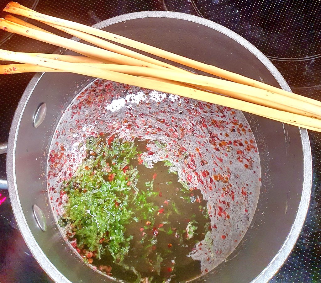 For å lage sirupen knuste jeg pepperkornene i en morter (du kan også bruke en kjevle ved å legge kornene mellom to lag matpapir). Kokte opp de knuste kornene sammen med sukker og vann til sukkeret var oppløst, ca 2 minutter. Satte gryten tilside og rørte inn limesaften og det revne skallet. Avkjølte blandingen til minst romtemperatur.