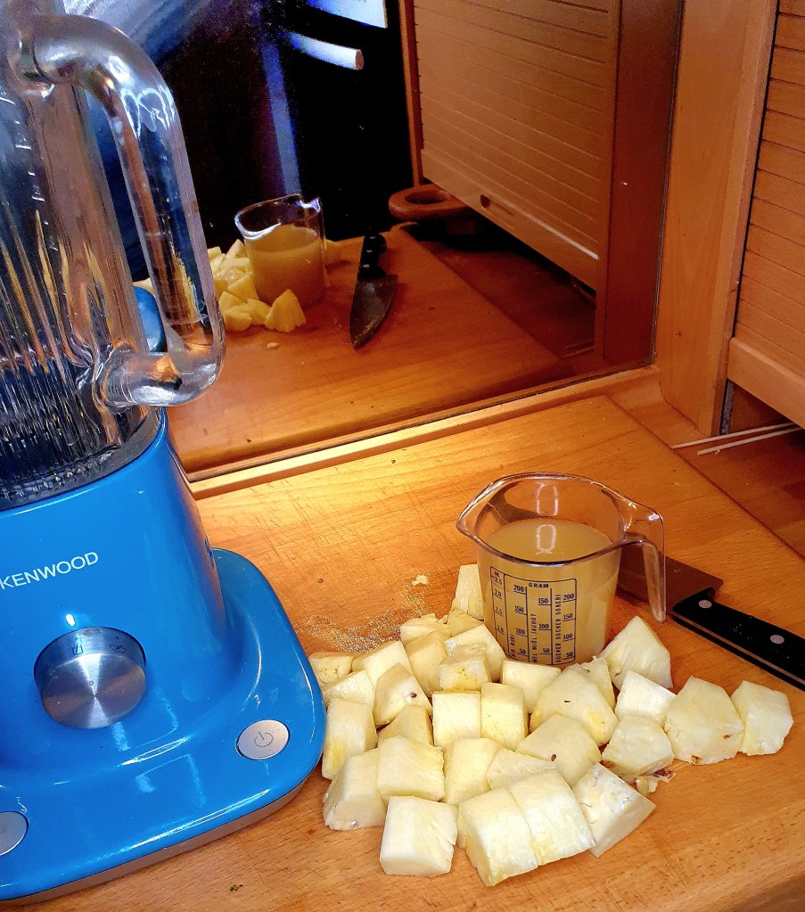 Ananasen ble skrelt og delt i 4. Rotstokken ble fjernet fra alle de fire delene. Anansen ble videredelt i grove stykker som sammen med ananasjuicen ble kjørt i en blender til en glatt masse. Pepperkornblandingen ble silt og væsken ble tilsatt ananasblandingen og alt ble blandet godt. Pepperblandingen ble tatt vare på.