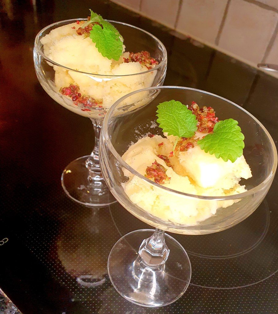 Alt ble helt i en ismaskin som kjørte i ca 45 minutter til konsistenesen lignet en myk sorbet. Helte massen over i en form som ble dekket til og fikk stå i fryseren i minst 6 timer. Hvis du ikke har ismaskin kan du helle massen i en form og sette i fryseren. Det er viktig da at du rører med jevne mellomrom slik at det ikke danner seg iskrystaller i sorbeten.