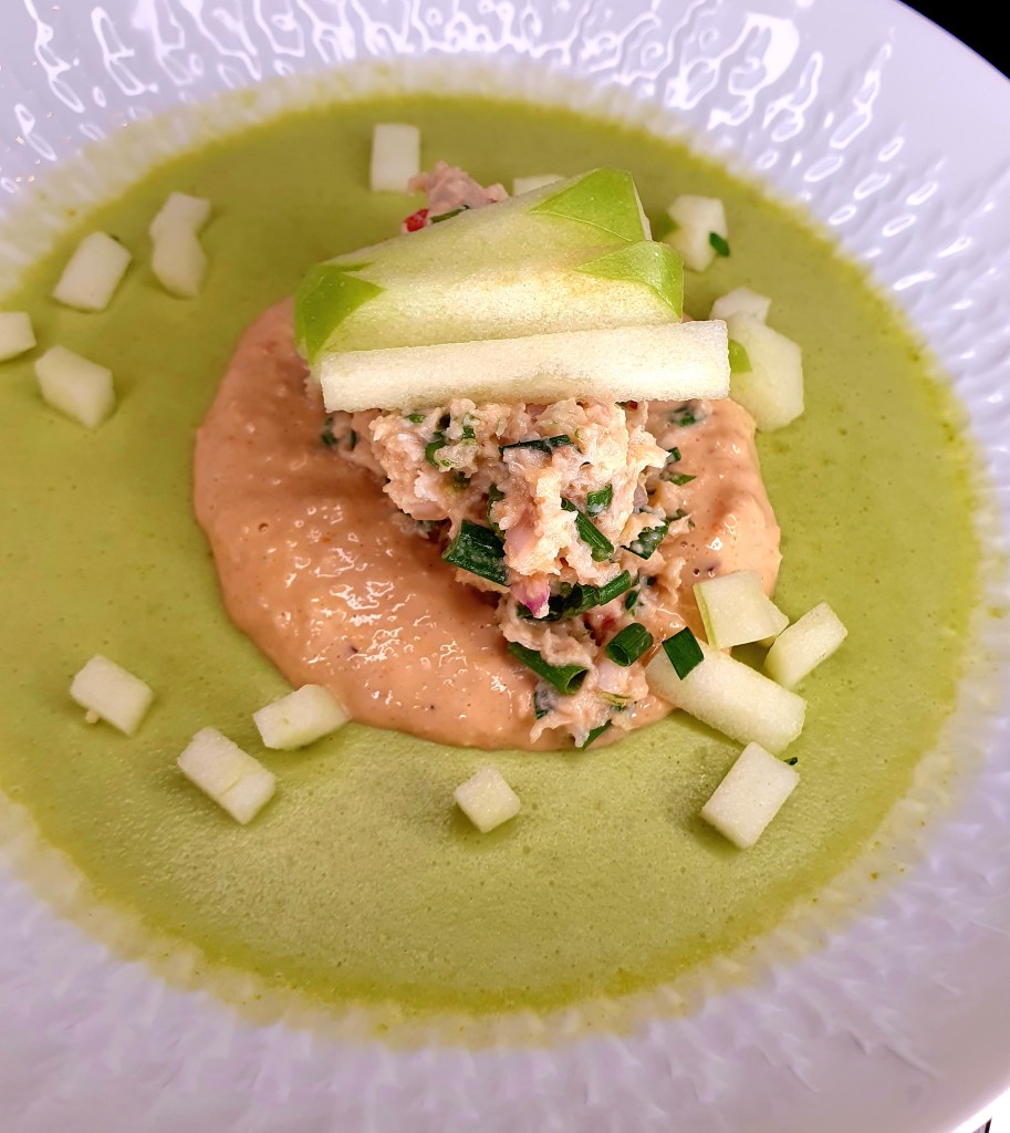 Ved servering ble en klatt med brun majones lagt midt oppå pannacottaen og en spiseskje av det hvite krabbekjøttet oppå der igjen. Noen staver av det grønne eple ble lagt på toppen av krabbekjøttet og små terningen av eplet ble spredd rundt på pannacottaen.
