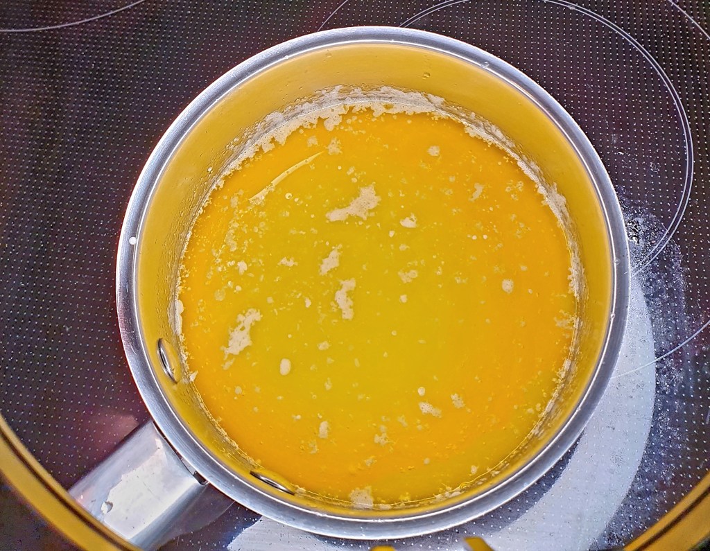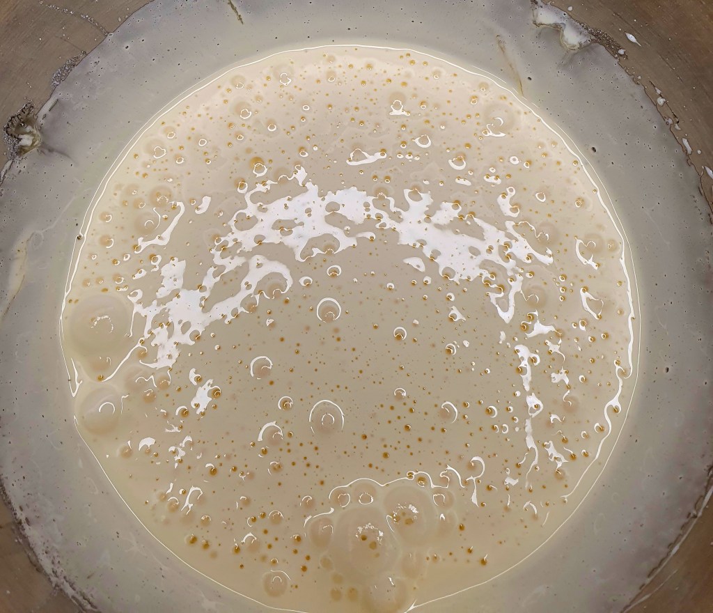 Egg og sukker ble pisket til det ble en luftig eggedosis. Smøret ble smeltet og tilsatt melken. Alt det tørre ble blandet og deretter siktet oppi eggedosisen.