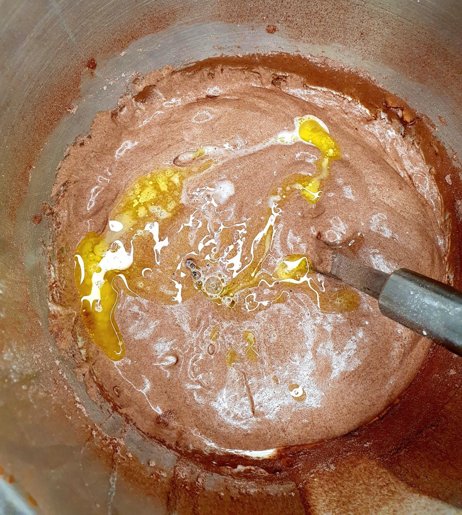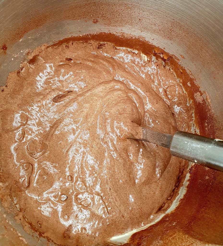 Blandet inn det tørre før smørblandingen ble tilsatt (den bør være litt avkjølt). Rørte godt slik at alt blandet seg.