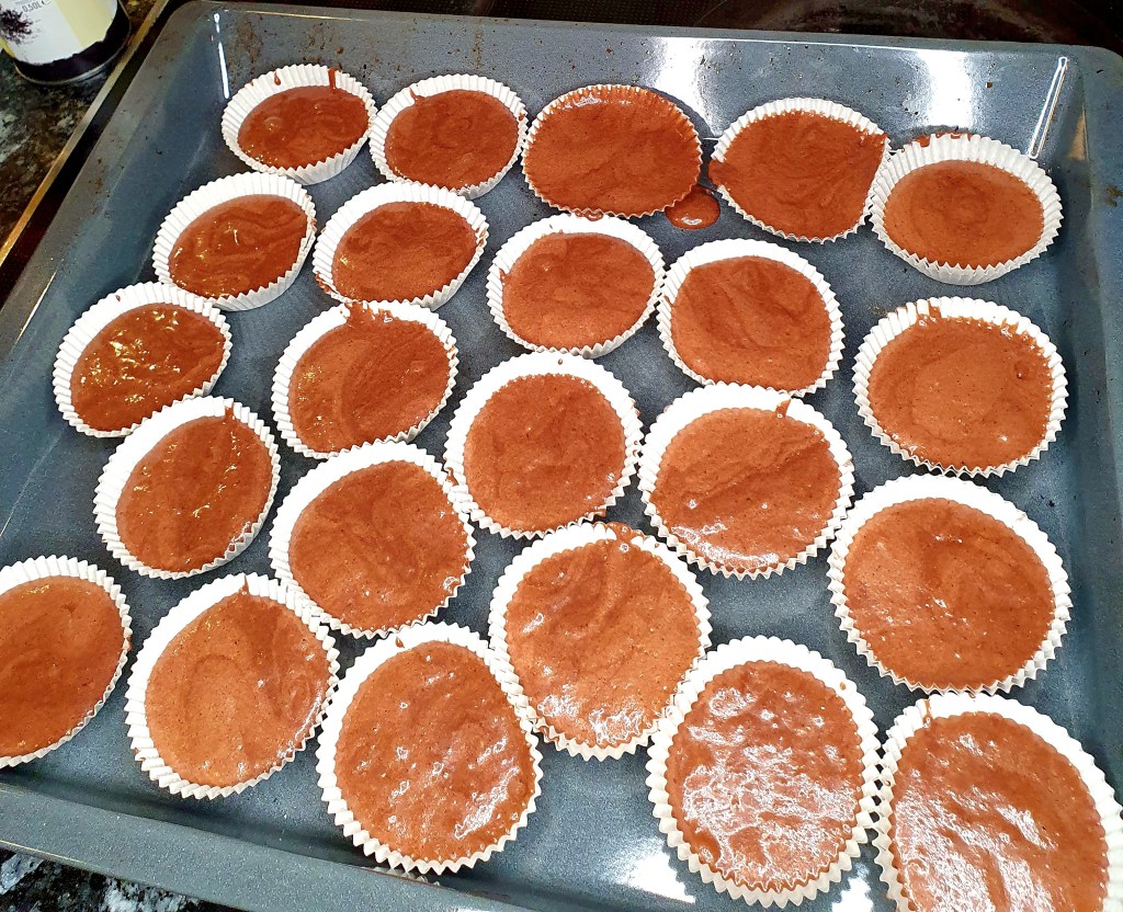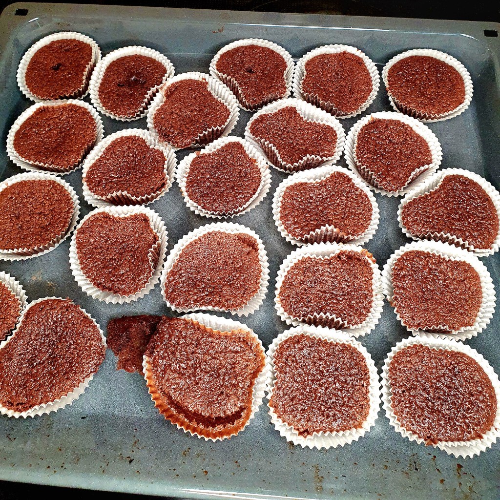 Røren ble fordelt i ca 30 små doble muffinsformer- ca 3/4 fulle (det varierte litt). Muffinsene ble stekt ved 175 grader C i ca 15 minutter- det kan nok variere fra ovn til ovn.