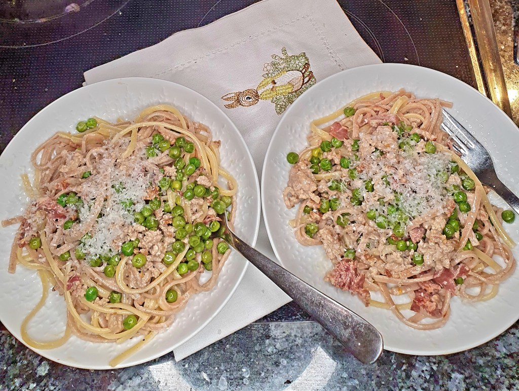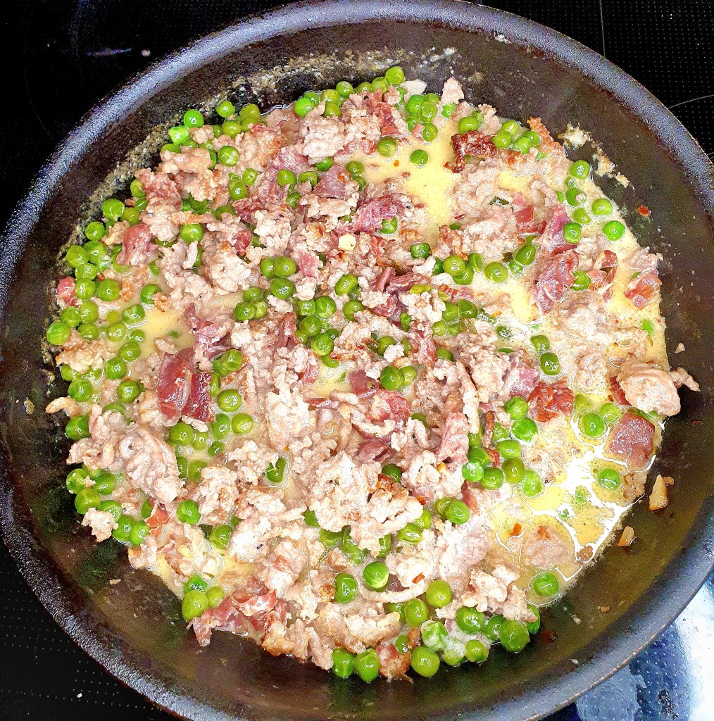 Hadde så i finhakket hvitløk, salvie, erter og matfløte og lot alt koke noen minutter. Rørte inn par øser pastavann, sausen må være ganske flytende fordi den kokte pastaen jo skal vendes inn. Etter at alt var blandet godt, ble finrevet parmesan tilsvarende ca 4-5 spiseskjeer rørt inn.