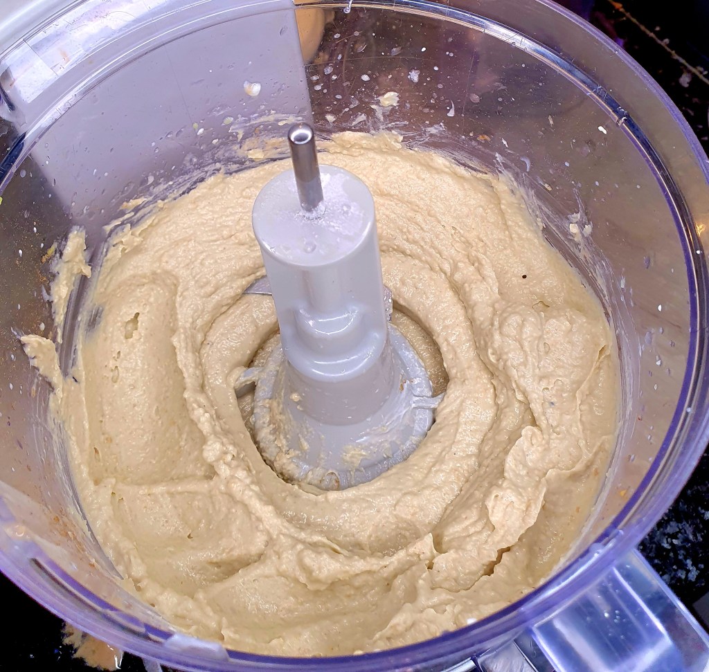 Hummusen lages ved å blende avrente kikerter (ta vare på vannet i boksen i tilfelle du vil tynne hummusen litt), avokadobiter, creme fraich, tahini, spisskummin, hvitløksbåter i biter og limesaft til du har en jevn og glatt røre. Smak til med salt og evt juster konsistensen med litt kikkertvann. Hvis du vil ha den helt silkeglatt kan du gni den med baksiden av en skje gjennom en melsikt.