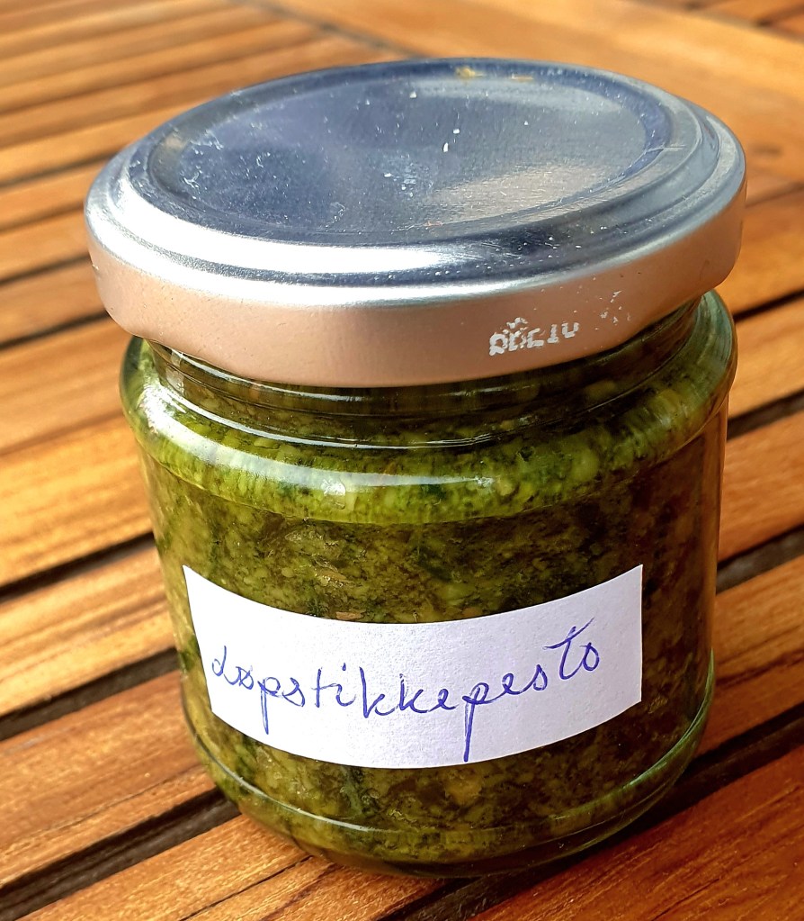 Pesto kan lages av så mangt. Her har jeg brukt pesto laget av løpstikke, en gave fra en venn. Løpstikke smaker veldig forskjellig fra basilikum som pesto oftest lages av. Smaken minner om en sterk buljong eller som selleri. Det finnes mange oppskrifter på løpstikkepesto der ute og ofte inneholder de forskjellige nøtter i stedenfor pinjekjerner eller en kombinasjon av dem. Pga den sterke smaken løpstikke har i seg selv er det ikke nødvendig med så mye hvitløk. Løpstikkepesto smaker nydelig.