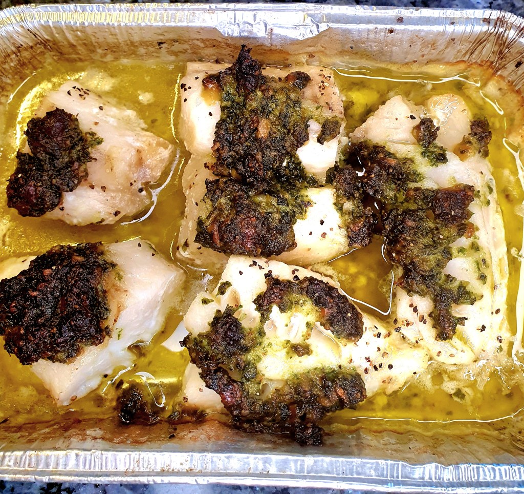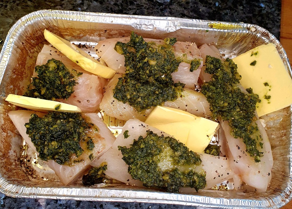 ca 500 gram isgaltfilet (du kan gjerne bruke annen hvit fisk) ble delt i porsjonsstykker og lagt i en grillform med litt olje i bunnen. Drysset over litt grov pepper. Du kan gjerne salte også, bare husk at pestoen er salt. En stor spiseskje pesto ble fordelt over fiskestykkene. Noen smørklatter ble lagt imellom fisken og en halv sitron ble presset over.