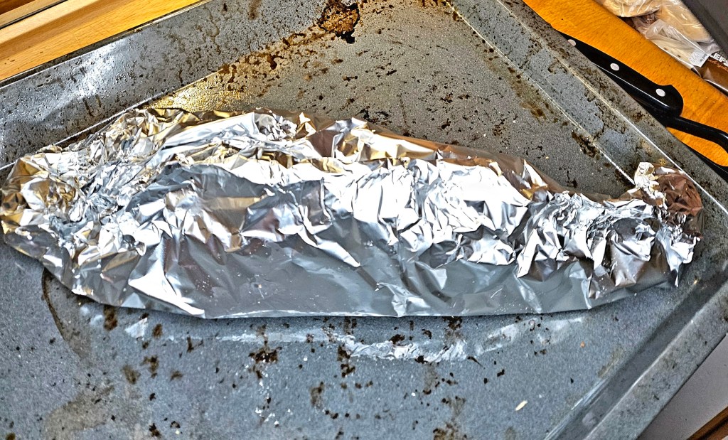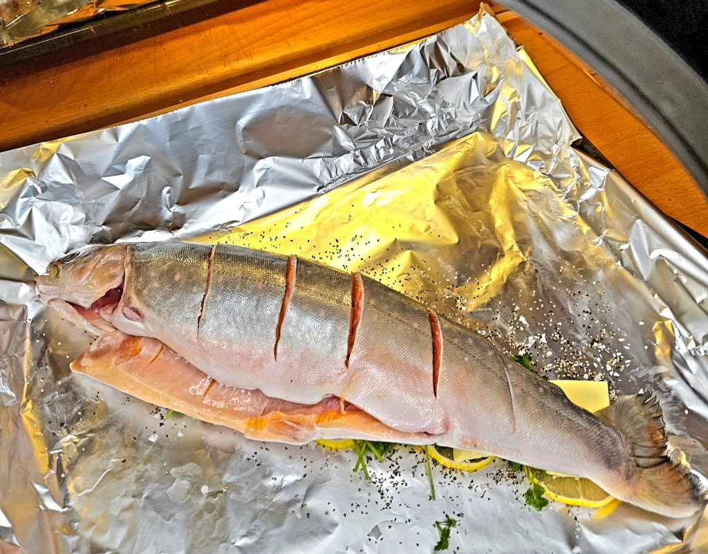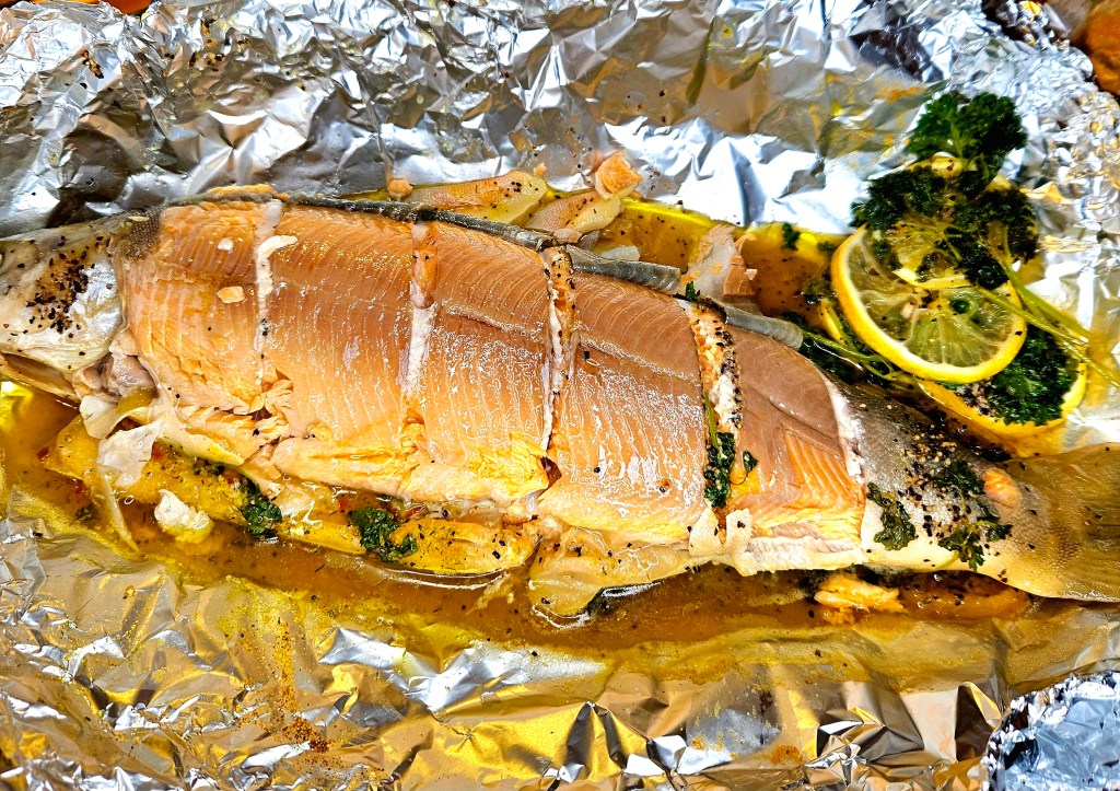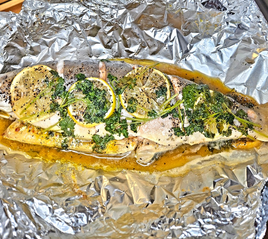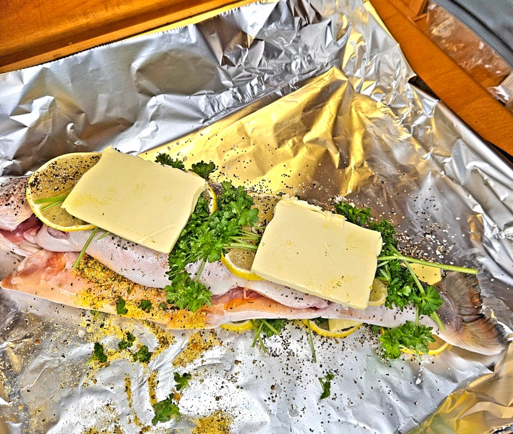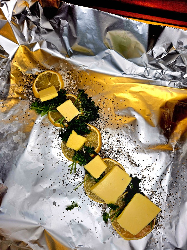 Et dobbelt lag med aluminiumsfolie ble lagt i en langpanne. Salt, pepper, sitronskiver, persille og smør ble plassert på folien og fisken ble lagt oppå. På toppen av fisken ble det også lagt et lag med salt, pepper, sitron, persille og smør. Folien ble pakket tett rundt fisken.