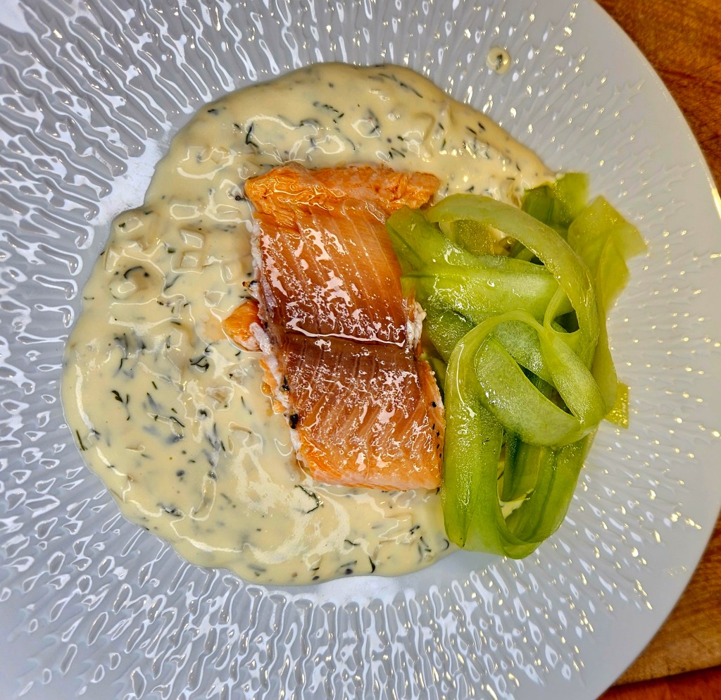 Sausen ble laget ved å koke inn løken sammen med hvitvinen til det bare var bittelitt væske igjen. Tilsatte deretter fløten og reduserte ved full guffe i 3-4 minutter før creme fraichen ble rørt inn. Finhakket dill (mengde etter ønske) og litt sitronsaft ble tilsatt.