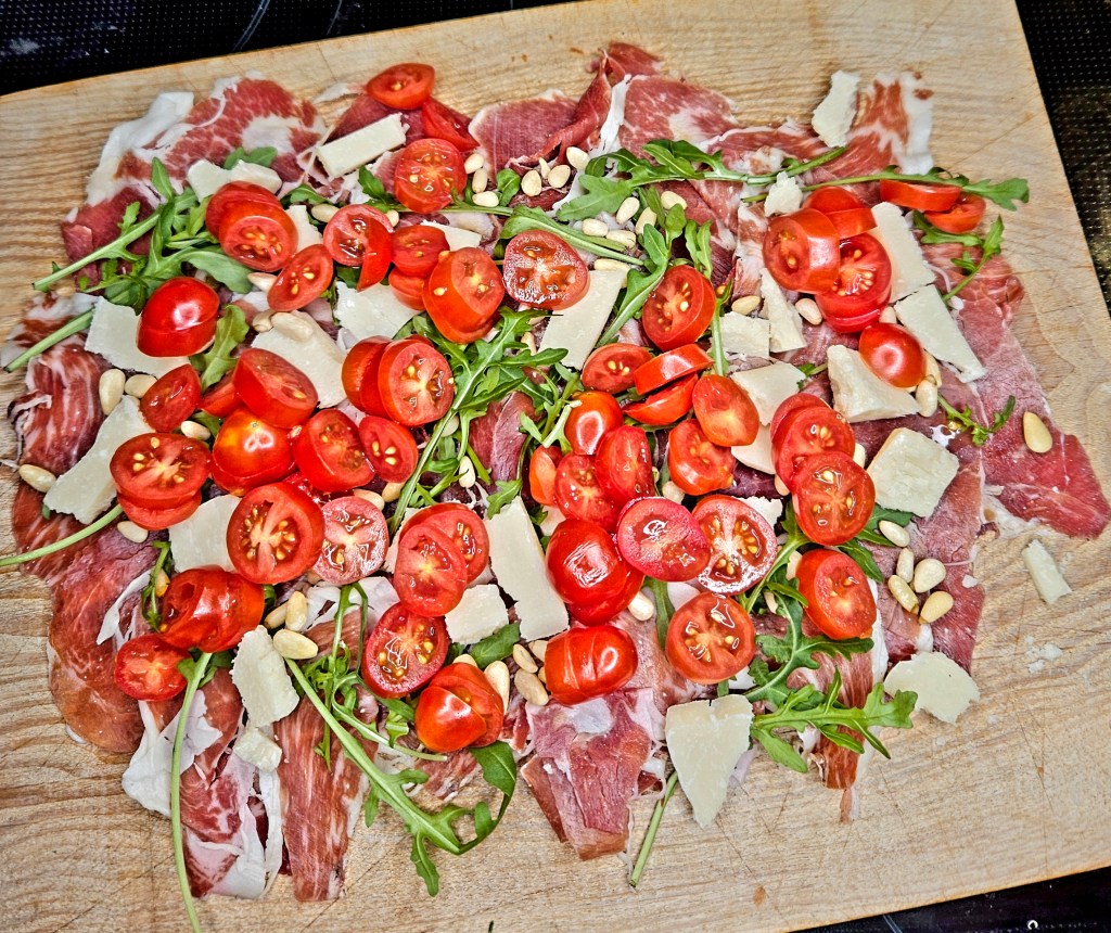 Dette er en veldig enkel salat. Skinkeskivene ble lagt utover fjøla. Ruccolasalat (du kan også bruke annen salat med litt smak i) ble strødd over skinka og skiver av parmesan ble lagt ovenpå. Du kan gjerne bruke annen fast ost- den bør ha litt smak. Fetaost er også et alternativ. Så ble skiver av små tomater og ristede pinjekjerner lagt oppå der igjen. Rett før servering ringlet jeg over olivenolje med litt fruktig smak pluss noen dråper balsamico.