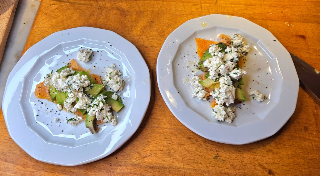 Ved servering ble lakseskivene fordelt utover en porsjonstallerken. Avokadoskiver ble fordelt over og fetarøre på toppen.