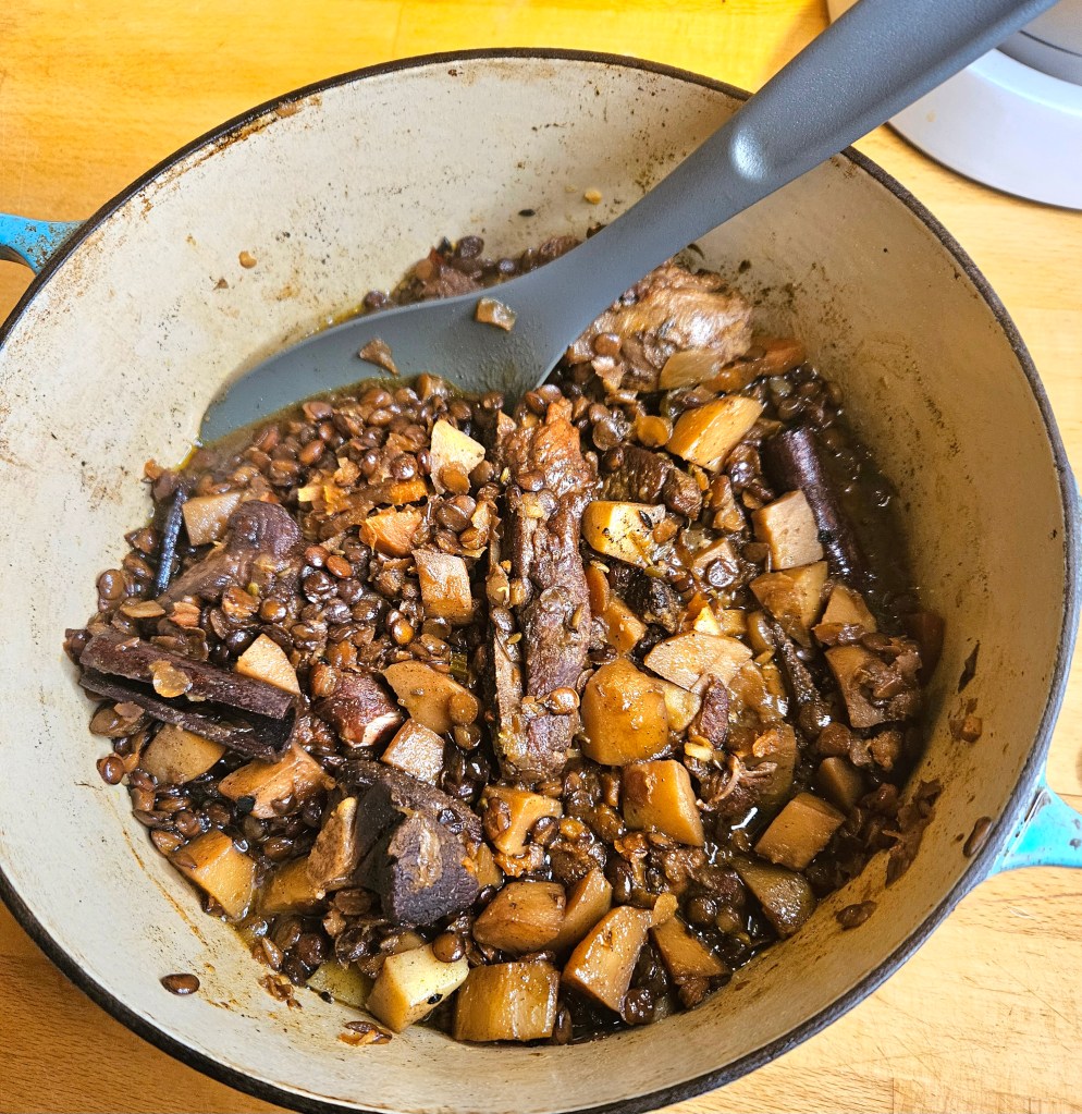 På grunn av den mørke kjøttbuljongen som brukes i denne gryta får det meste i gryta en mørk farge. La deg ikke lure- smakene er helt vidunderlige. Jeg har brukte får-i-kål kjøtt fra bogen her som er skåret i grove biter og beina er beholdt for å gi en ekstra dyp smak. Kjøttet trenger litt koketid, men da kan du gjøre noe annet kjekt. Kjøttet gnis inn med en krydderblanding på forhånd- lag gjerne en større porsjon enn det som er angitt her og oppbevar i kjøleskapet. Den kan brukes på annet kjøtt også, ja sågar kylling.