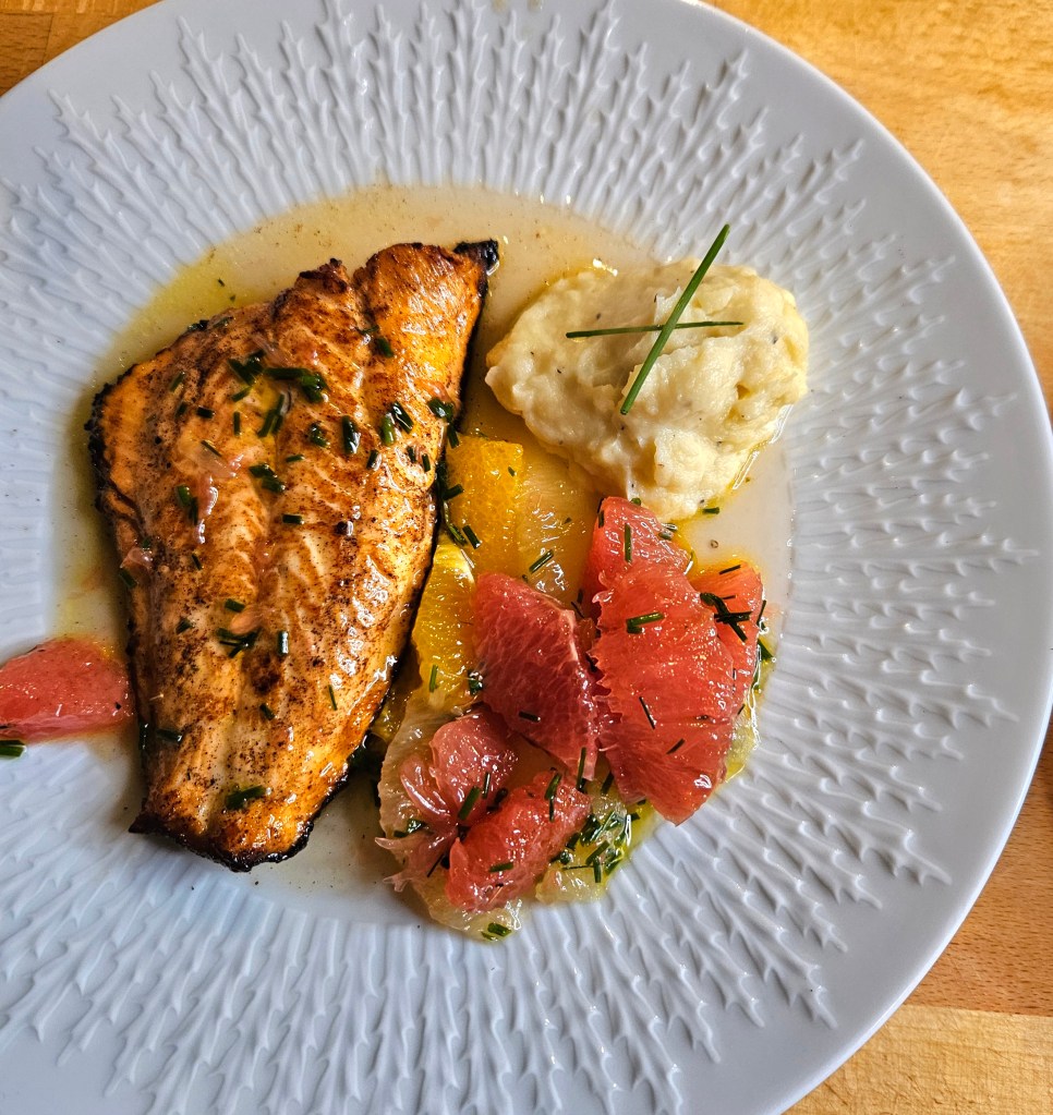 Serverte fisken med sitrussausen og pastinakkpurè (oppskrift her). Og riesling i glasset… Godt godt..