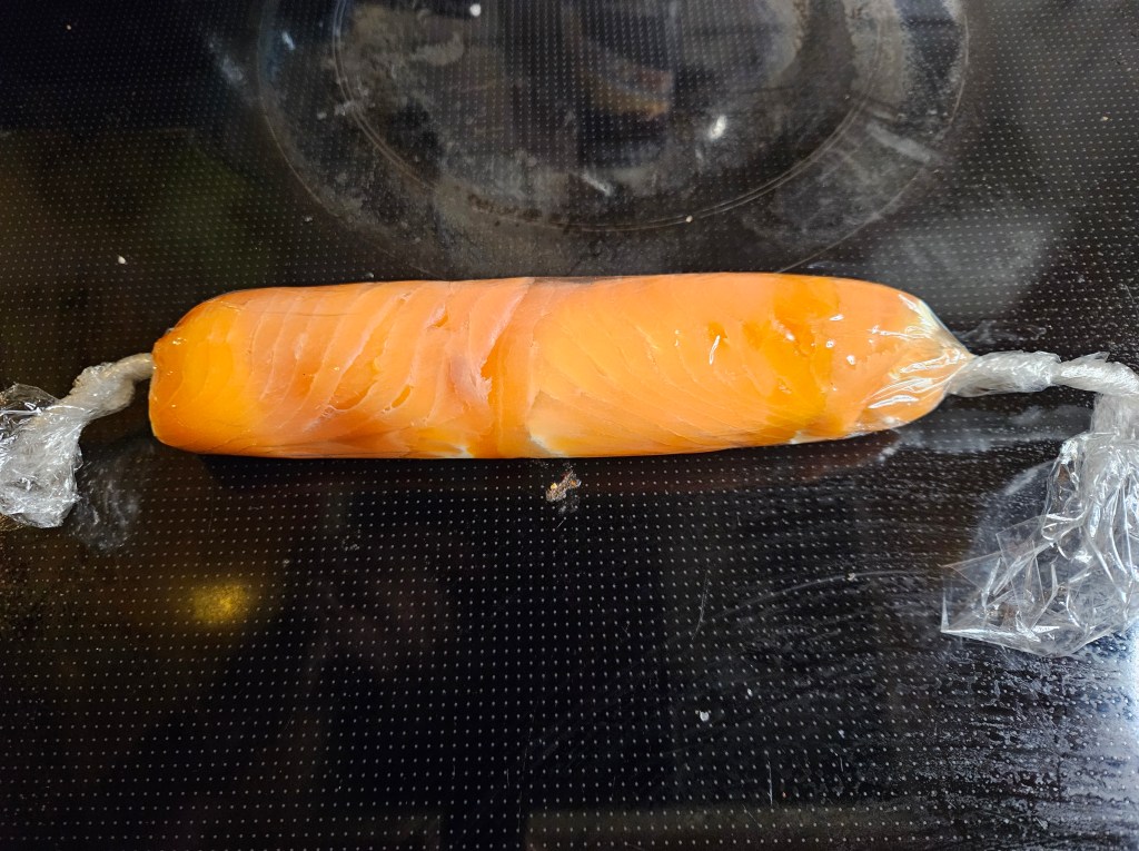 ca 100 gram røykelaks i skiver ble lagt utover en film av plast. Skivene må overlappe hverandre. Ostemassen ble smurt utover slik at den dekket hele laksen.