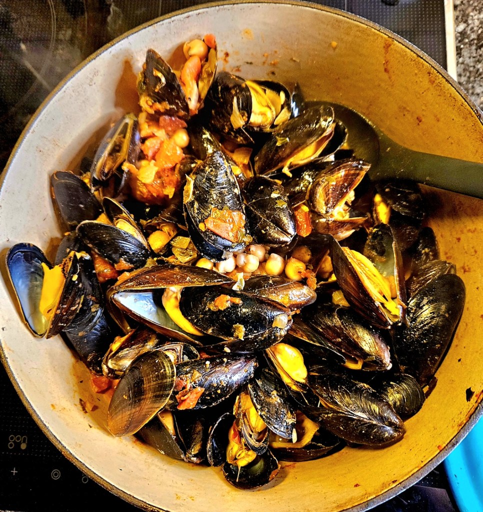 Jeg har litt dilla på smaker fra Midtøsten, denne gangen kombinert med blåskjell og kikerter. Kokte blåskjell er noe av det raskeste du kan lage til middag. Jeg bruker ikke mye tid på å rense blåskjellene vi får kjøpt, de er jo oppdrettsskjell og det er sjeldent at de har sand. Jeg legger dem i en bolle med kaldt vann og sorterer bort de som er ødelagte. Hvis skjellene har kraftige bysusstråder klipper jeg dem ,men min erfaring er at det er sjeldent. Jeg foretrekker store skjell, jeg dropper dem hvis de er veldig små.