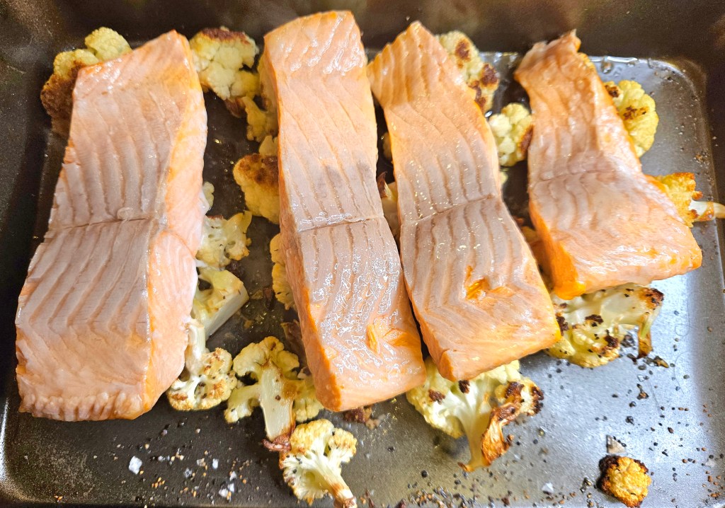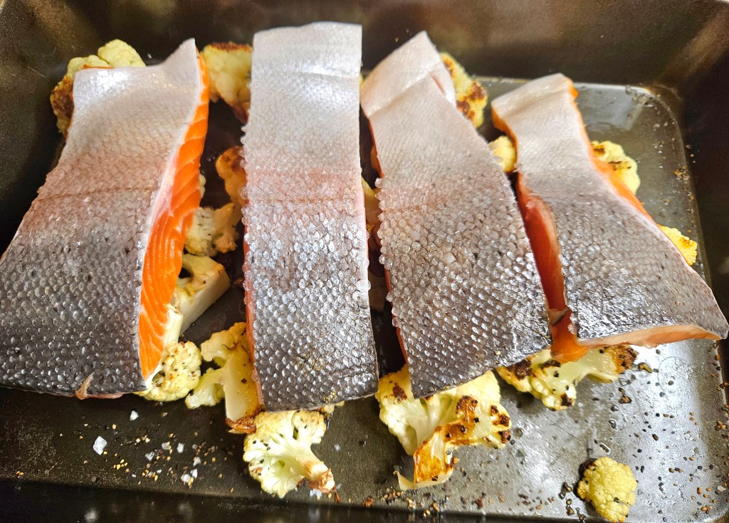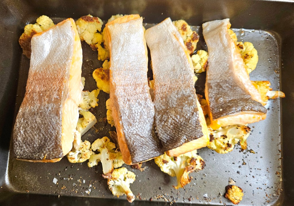 Bakte blomkålet ved 210 grader C til bukettene begynte å få farge, det tok ca 17 minutter. Tok ut langpannen og snudde bukettene. La over fiskestykkene med skinnsiden opp. Helte over litt olje og drysser litt mer salt og pepper over fisken. Bakte videre i ovnen i ca 10 minutter- det avhenger av størrelsen på fiskestykkene.