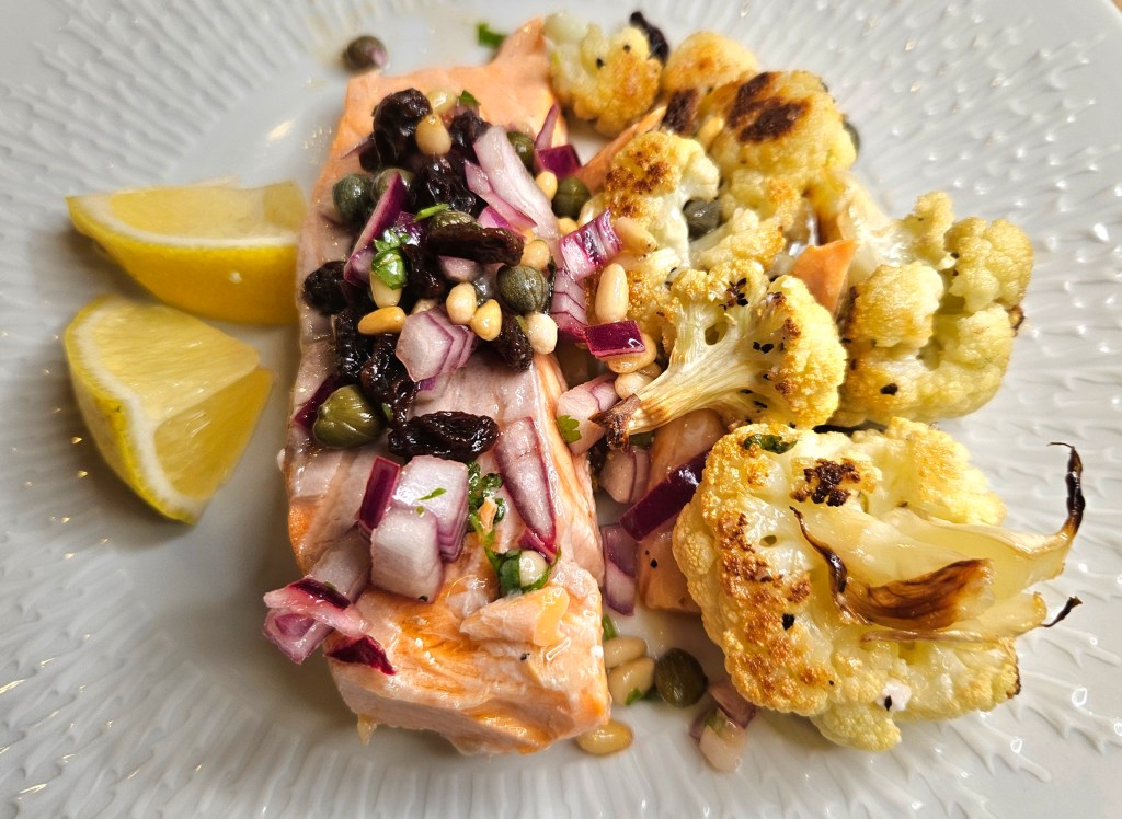 Vi spiste rettene uten noe tilbehør, salsaen er full av smaker, fiskestykkene saftige og blomkålet har en fin konsistens og nøttesmak. Server gjerne med ris eller poteter hvis du vil ha et litt mer mettende måltid.