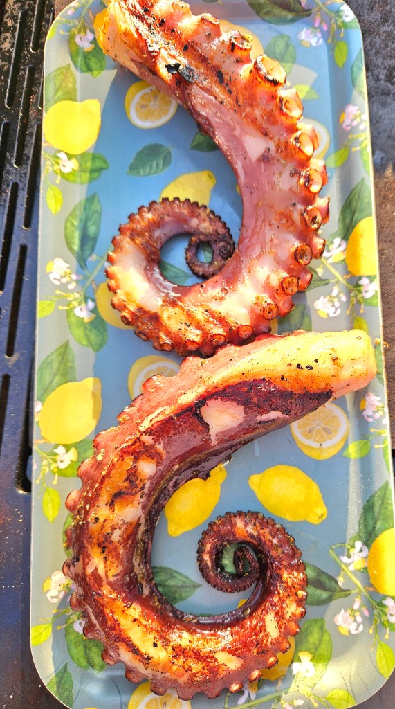 Blekksprutarmene ble grillet på middels varme i ca 4 minutter på hver side, fargen skal være gylden.