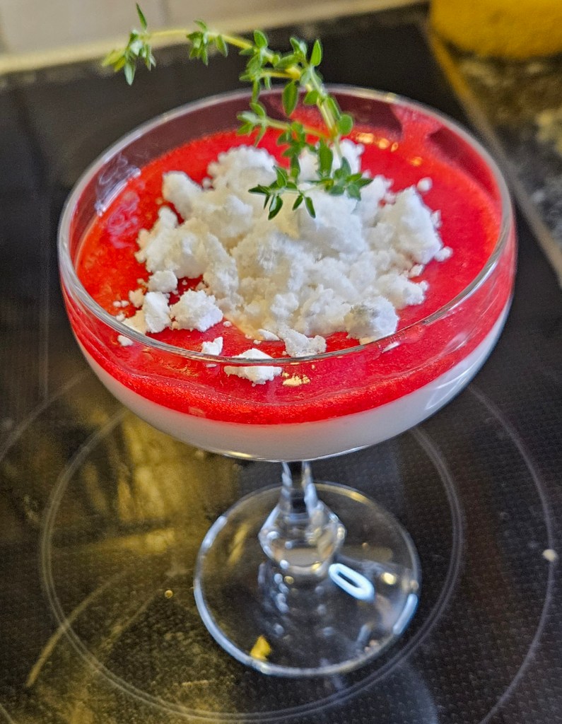 Ved servering ble sausen lagt rundt kanten av glasset oppå panna cottaen med knust marengs i midten. Pyntet med en timianstilk (evt annen urt). Frisk og god dessert…