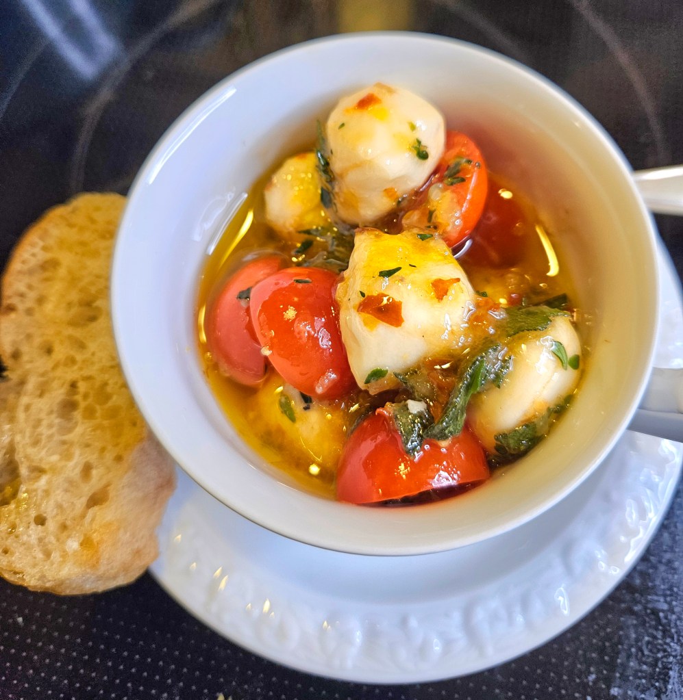 Dette er ment som en liten snack rett eller appetizer. Mozarella er en ferskost som opprinnelig ble laget av bøffelmelk. Selv om du kan kjøpe bøffel mozarella i dag er det vanligst med mozarella laget av kumelk. I denne oppskriften er det brukt mini-mozarella av kumelk, jeg har aldri sett minimozarella laget av bøffelmelk her i Oslo. Mozarella laget av bøffelmelk har utvilsomt mer smak en den av kumelk som jeg personlig ikke syntes smaker noe særlig. Derfor er det lurt å marinere ostekulene for å tilføre den smaken du vil. Bruk de ferske urtene du har tilgjengelig.