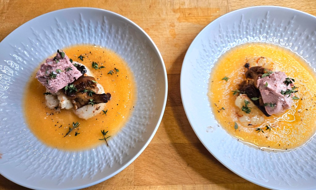 Har du en bit med foie gras fra boks (antagelig har du ikke det) eller en bit paté eller lignende så har du utgangspunkt for mange forretter. Her blir biten kombinert med stekte villreker og stekte kantareller sammen med en kald «suppe» av melon. Suppa kan lages på forhånd mens rekene og soppen bør være nystekte.