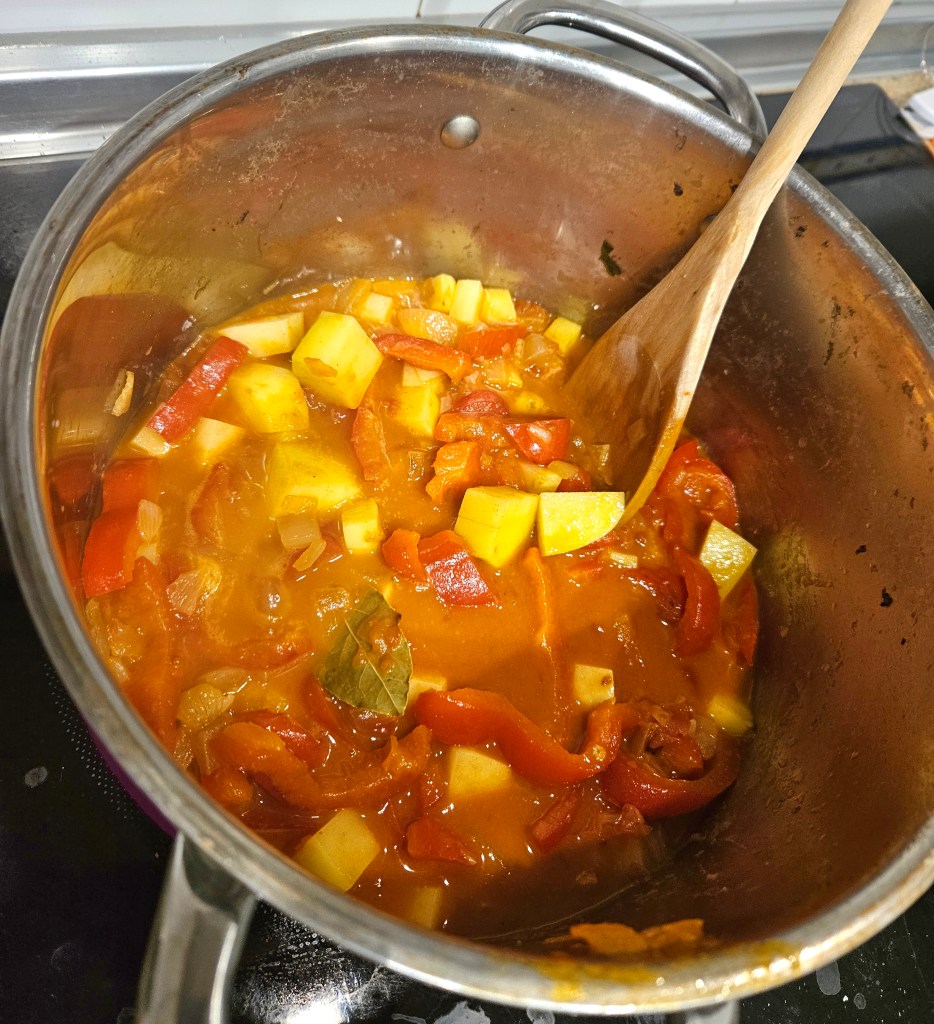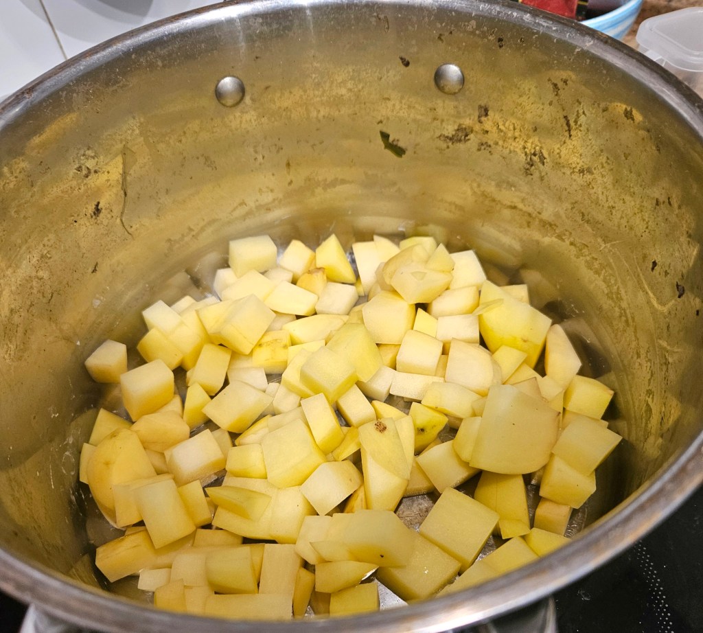 Plasserte potetbitene i en gryte og helte den kokende sausen over. Kokte til potene var ferdige.