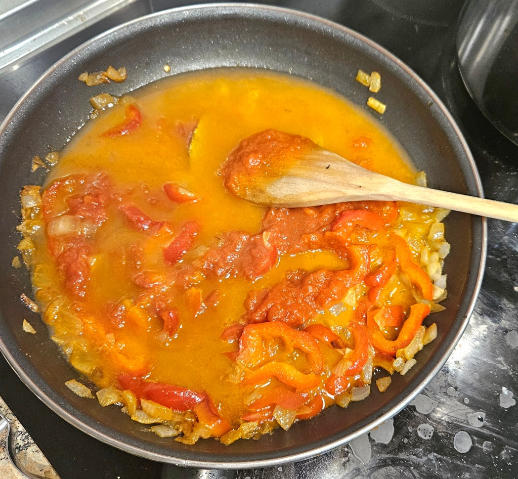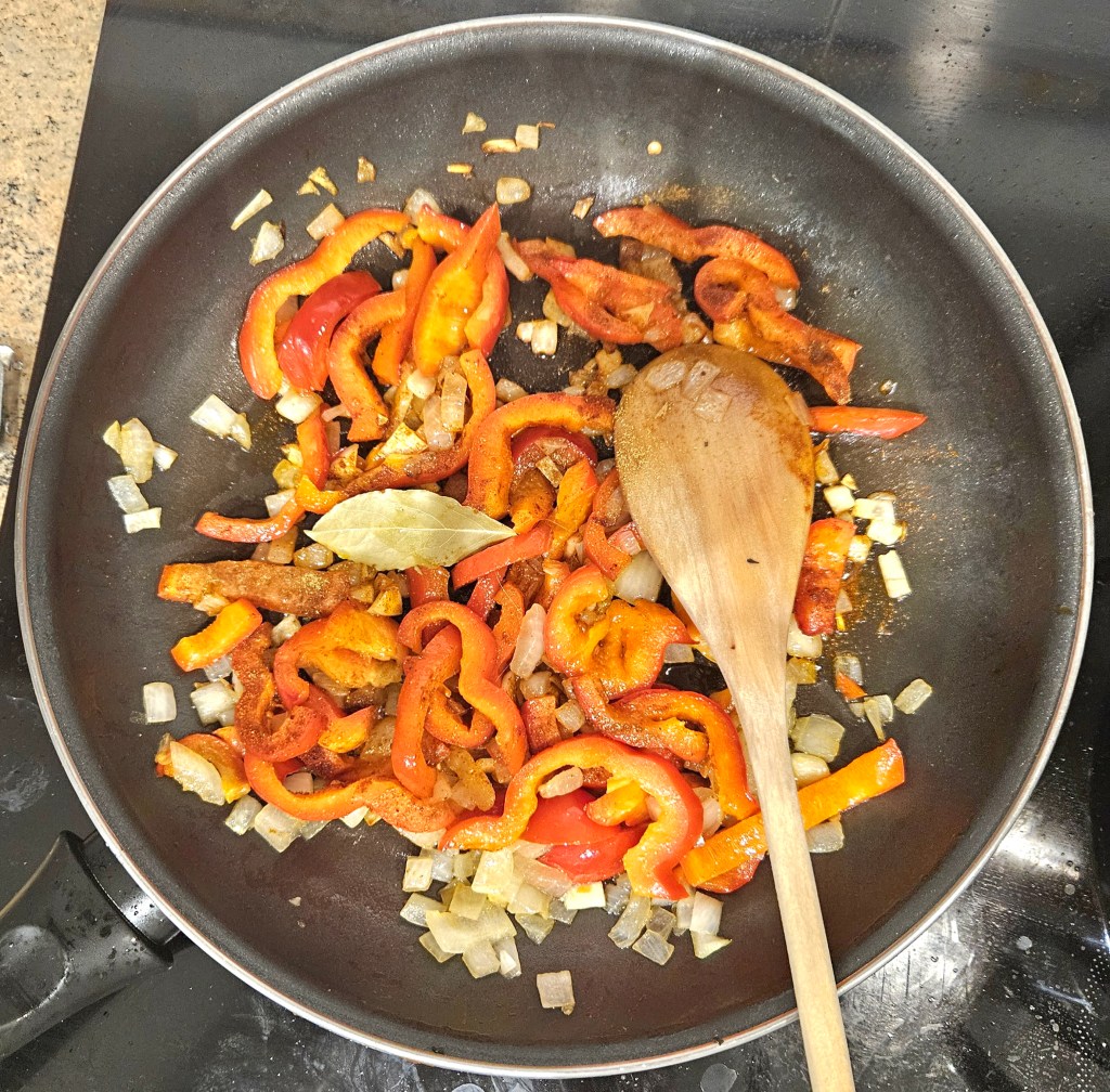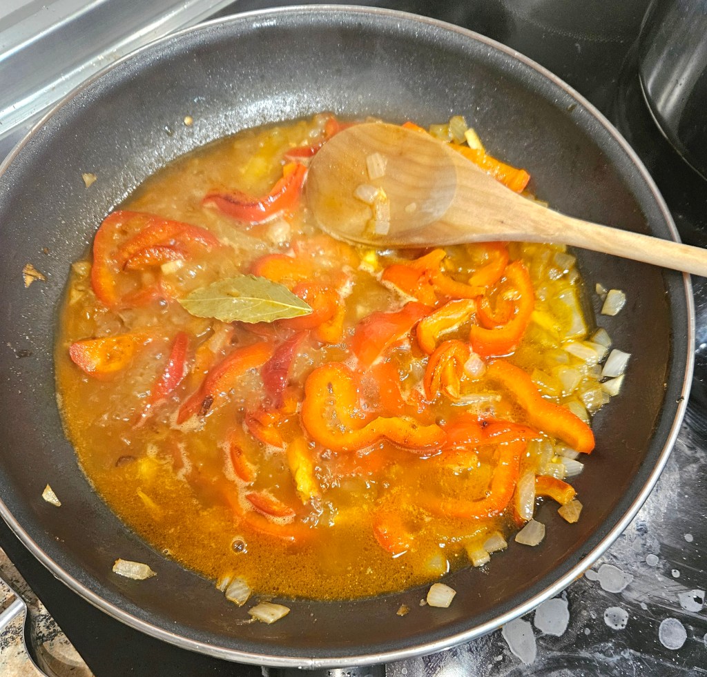 Løken og paprikaen ble stekt på middels varme til de begge begynte å få litt farge. Tilsatte så hvitløksskivene og stekte forsiktig videre i ca 5 minutter. Rørte hele tiden så ikke hvitløken ble brent. Nå ble stjerneanis, røkt paprika og laubærblad rørt inn og det hele kokte videre i ca 1 minutt. Tilsatte sherry og kokte opp. Reduserte varmen og kokte videre til væsken var redusert litt, 5-6 minutter. De avrente tomatene ble tilsatt sammen med fiskekraften og alt ble kokt opp igjen.