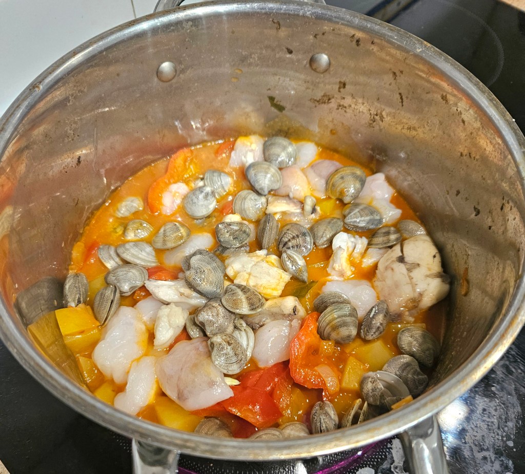 Jeg laget denne gryten mens vi var i Spania for en tid siden, derfor er noen av ingrediensene kanskje ikke så lette å få tak i her og kanskje også i dyreste laget. Fortvil ikke, det er fullt mulig å bytte ut med norske varianter. Breiflabben kan byttes ut med annen fast hvit fisk, feks brosme, lange eller lysing. Sandskjellene kan byttes ut med vongole skjell, skjønt de er dyre så bruk blåskjell i stedenfor. Gryten kan lages med bare fisk. Den blir litt mer luksuspreget hvis du også tilsetter skjell og noen rå scampi. Sausen har en rik og varm smak og passer godt i den mørke årstiden. Det er viktig at du bruker tomater som er godt modne- jeg anbefaler hermetiske av et godt merke, feks Mutti. Det er ikke lett å få tak i tomater med kraftig smak her i Norge.