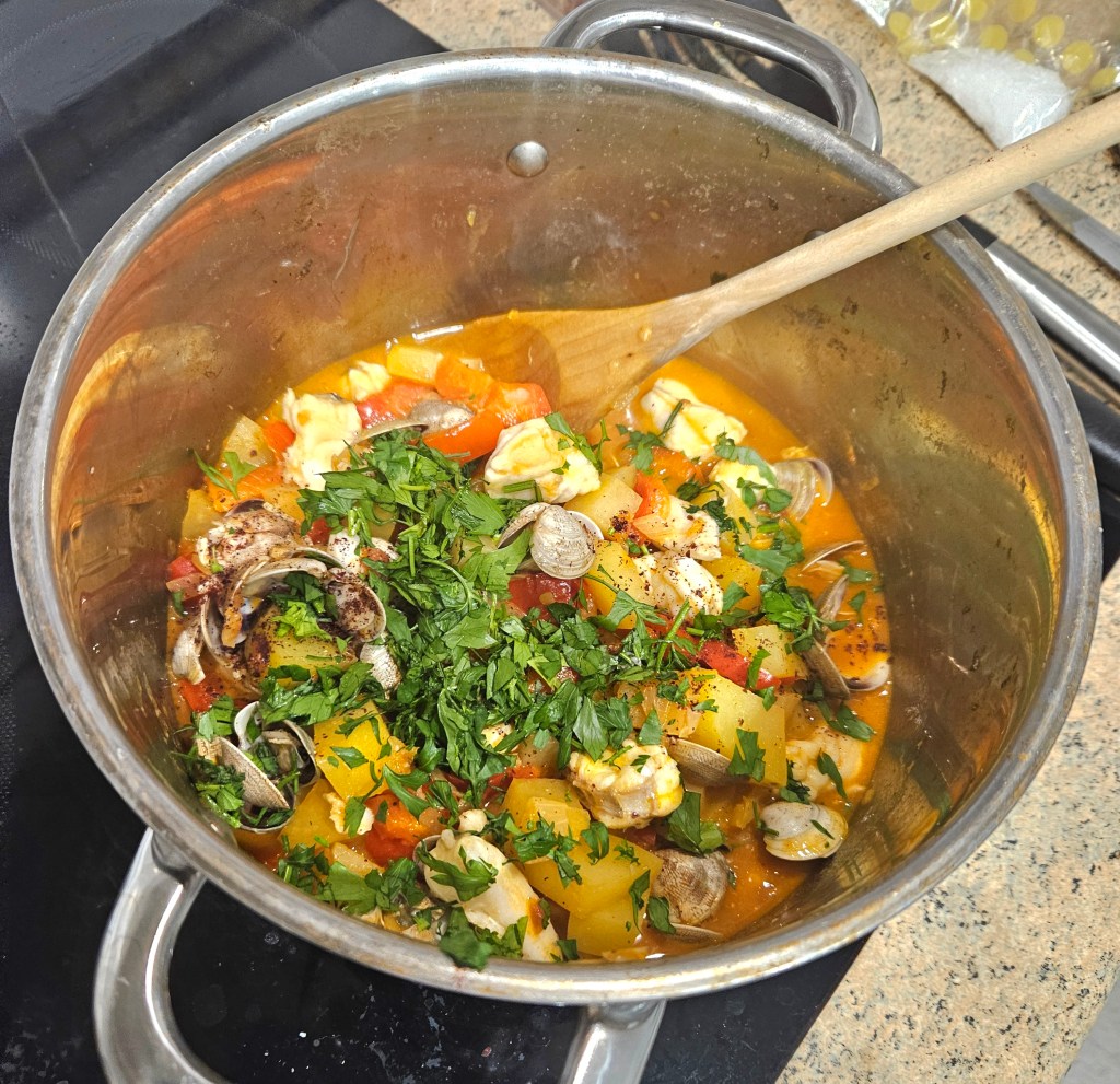 Tilsatte så fiskebitene og skjellene. Rørte ikke, løftet dem mer eller mindre inn i væsken. La på lokk og kokte til alt var gjennomkokt. Har du store fiskebiter ville jeg lagt dem oppi og latt dem koke før jeg tilsatte resten. Bruker du blåskjell kan du koke dem like lenge som store fiskebiter. Fjernet laurbærbladet og smakte til med salt og pepper. Tilsatte hakket bladpersille.