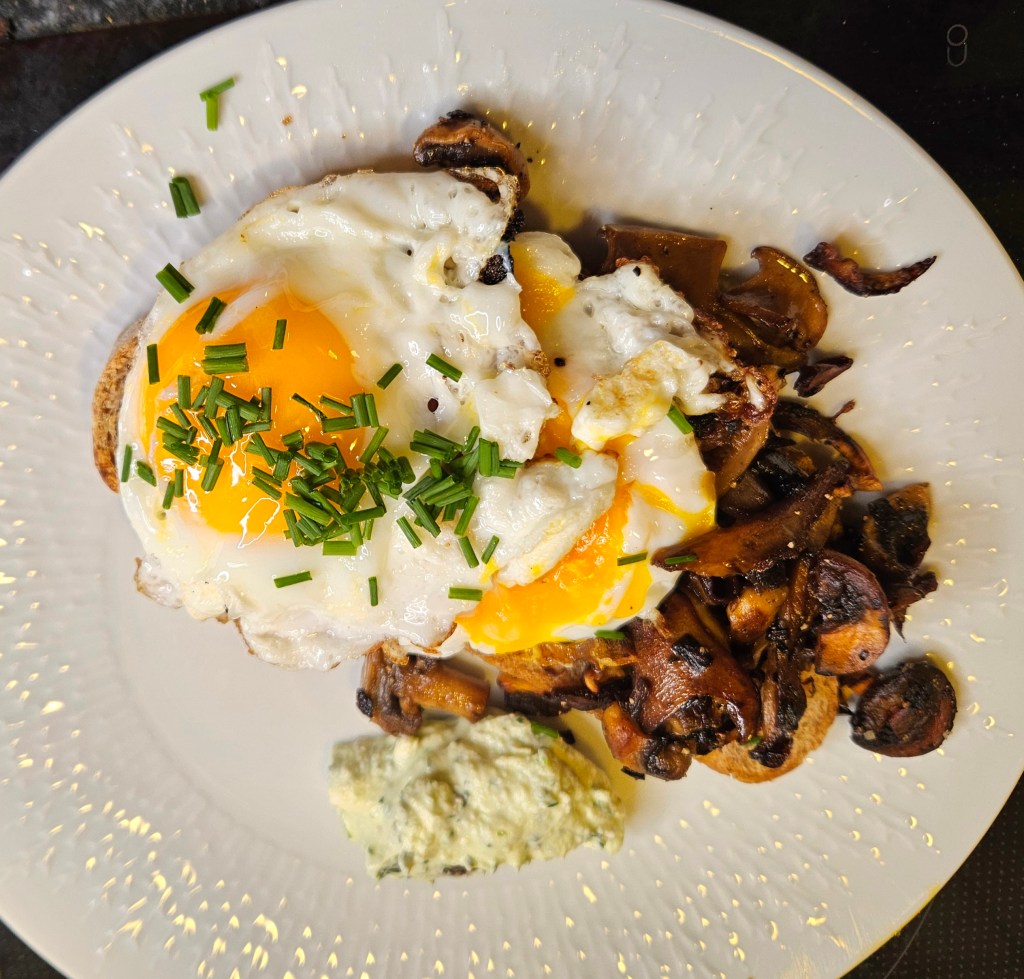 2 grove skiver ble stekt i olje på en varm panne til brødet var sprøtt. I en annen mindre panne ble soppen (mengde må du finne ut selv) stekt i en god del smør sammen med en finhakket sjalottløk og 2 finhakkede hvitløkbåter. Soppen skal ikke være sprø, men ha en gyllen farge. Krydret med salt og pepper. Har du lyst kan du tilsette en teskje karri under stekingen- du vil bli overrasket over hvor godt det er.