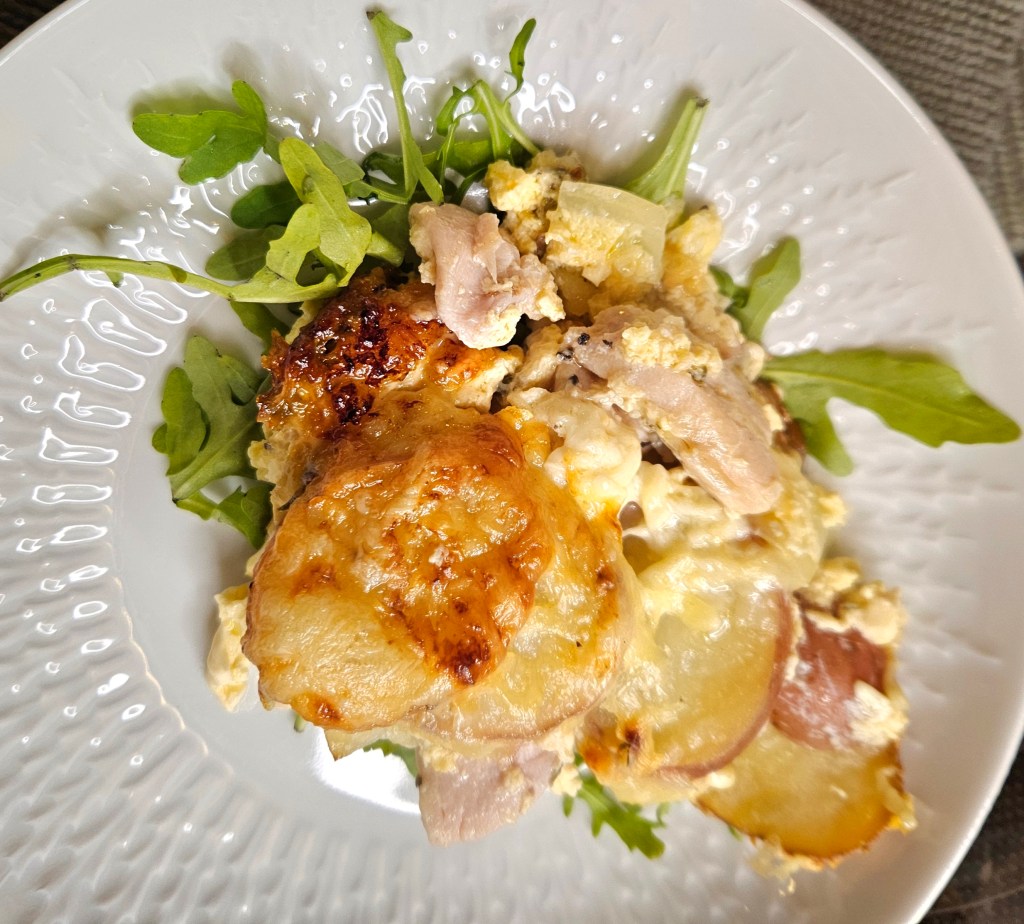 Gratengen fikk stå på benken i ca 10 minutter før den ble servert sammen med litt grønn salat.
