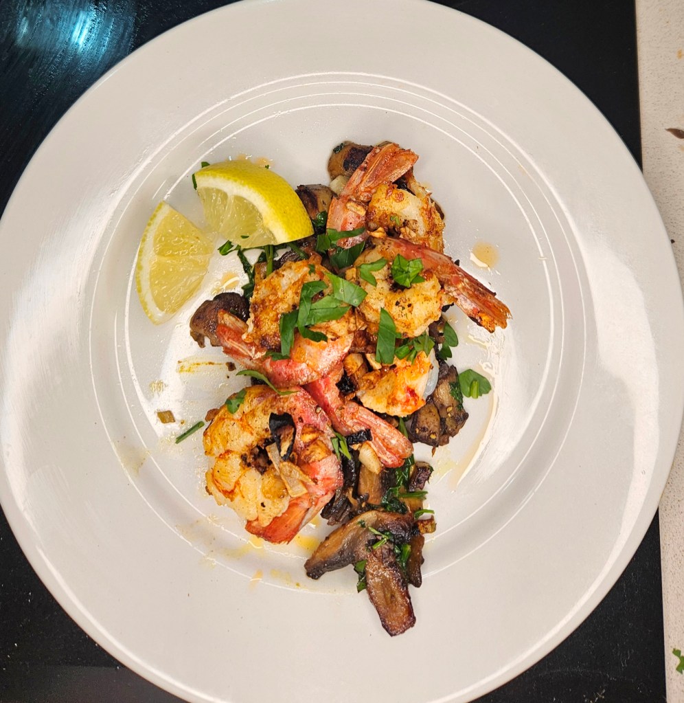 Dette er opprinnelig en spansk tapas rett. Vi har brukt den som hovedrett sammen med brød og aioli- både skalldyr og sopp er ganske mektig og vi var gode og mette etterpå. Retten blir best om du bruker rå reker, helst argentinske villreker. Vi er i Spania for tiden og der er det lett å få tak i frosne rå argentinske villreker med skall. Det er kanskje ikke så lett å få til i i Norge, men i Oslo har både Meny og Rema og sikkert andre også, frosne rå villreker uten skall. Du kan selvsagt også bruke scampie- de er bare litt anderledes i konsistensen.