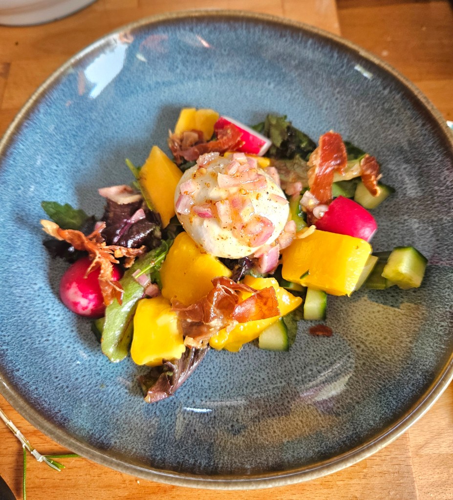 Ved servering ble litt feltsalat fordelt over tallerknene. 1/2 burrata ble plassert i midten med mango/urte/grønnsaksblandingen rundt. Resten av dressingen ble dryppet over osten. Litt sitronzest på toppen av osten og skinka ble drysser over til slutt.