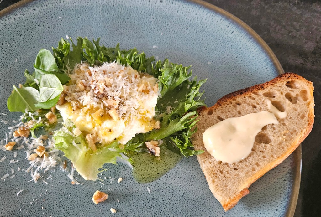 1/2 burrata pr person ble lagt oppå et salatblad på en tallerken. Oljen ble ringlet over osten og en liten skje av nøtte og parmesanblandingen ble lagt på toppen. Pyntet med litt revne basilikumblader og serverte med ristet surdeigsbrød med aioli.