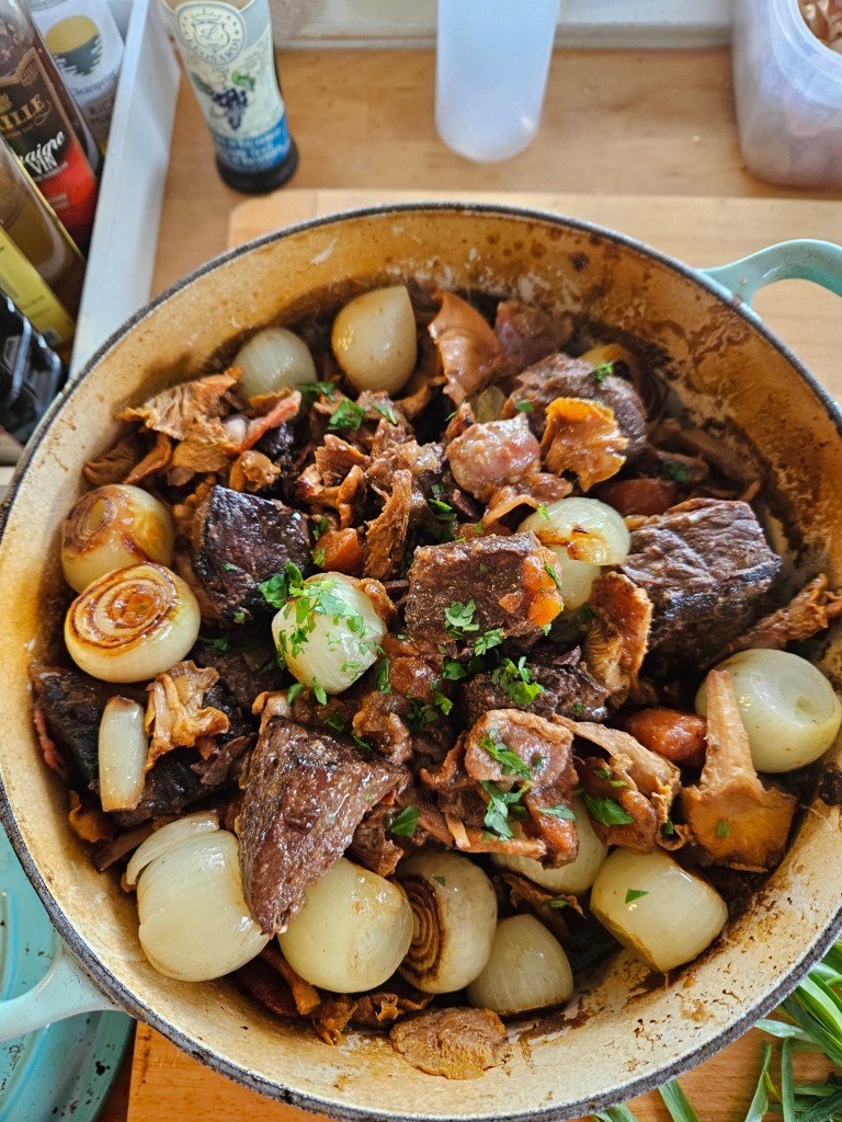 Jeg har tidligere lagt ut en oppskrift på denne kraftige gryteretten her. Det finnes mange varianter av biff bourguignon som alle bunner i at oksekjøtt blir kokt i rødvin. Denne gangen brukte jeg flatbiff av storfe skåret i ca 5×5 cm biter som ble marinert i rødvin i mer enn 1 døgn. Da ble kjøttet mørt og saftig, skjærer man i mindre biter og koker lenge blir kjøttet ofte litt tørt.