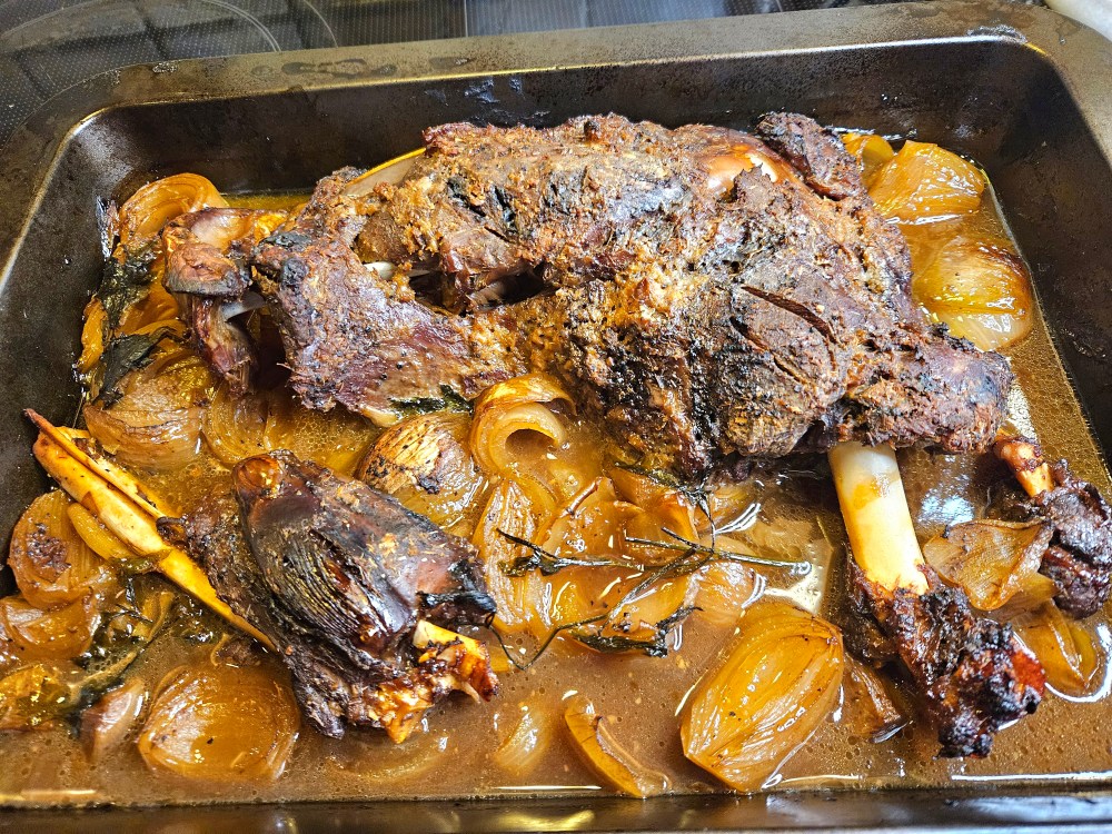Formen ble pakket inn i aluminiumsfolie og sto ved 160 grader i ca 3 timer. Da var kjøttet ferdig uten av det falt fra hverandre helt. Sjekket underveis at væsken ikke var fordampet.