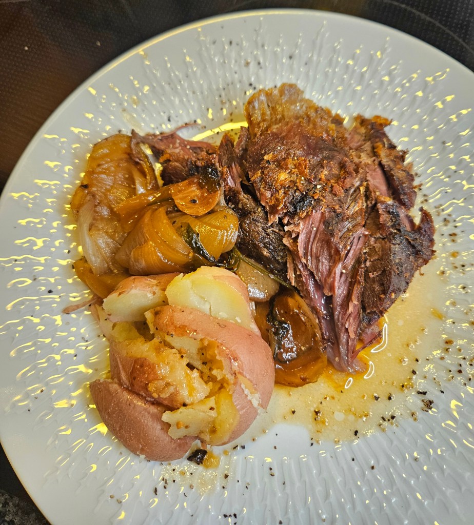 Ved servering ble formen satt direkte på bordet. Dette ble en stor opplevelse. Saftig mørt kjøtt, søte løk og en vidunderlig kraftsaus. Vi savnet ikke grønnsaker men det er selvsagt fritt frem.