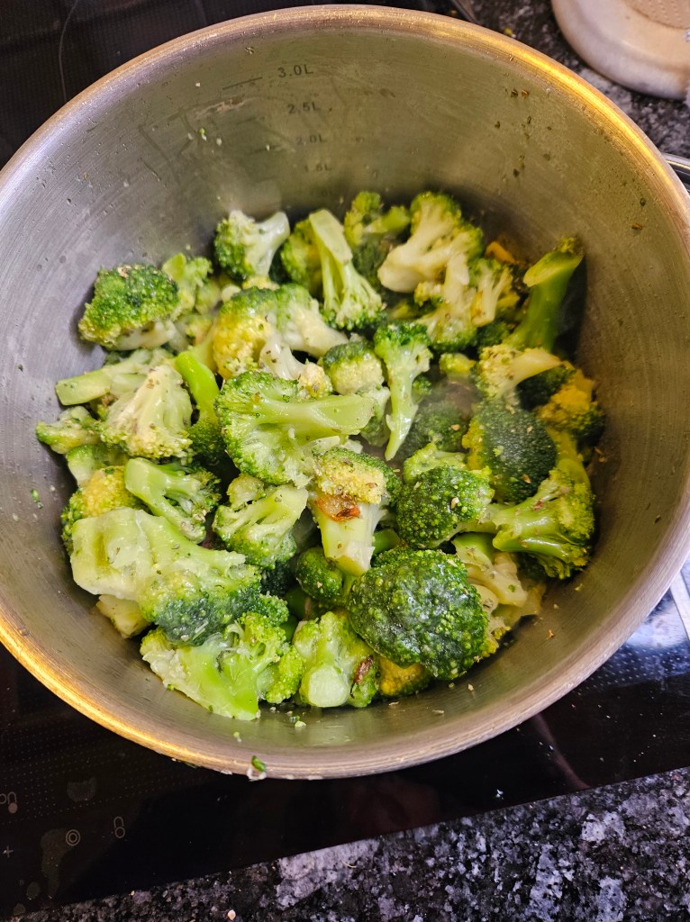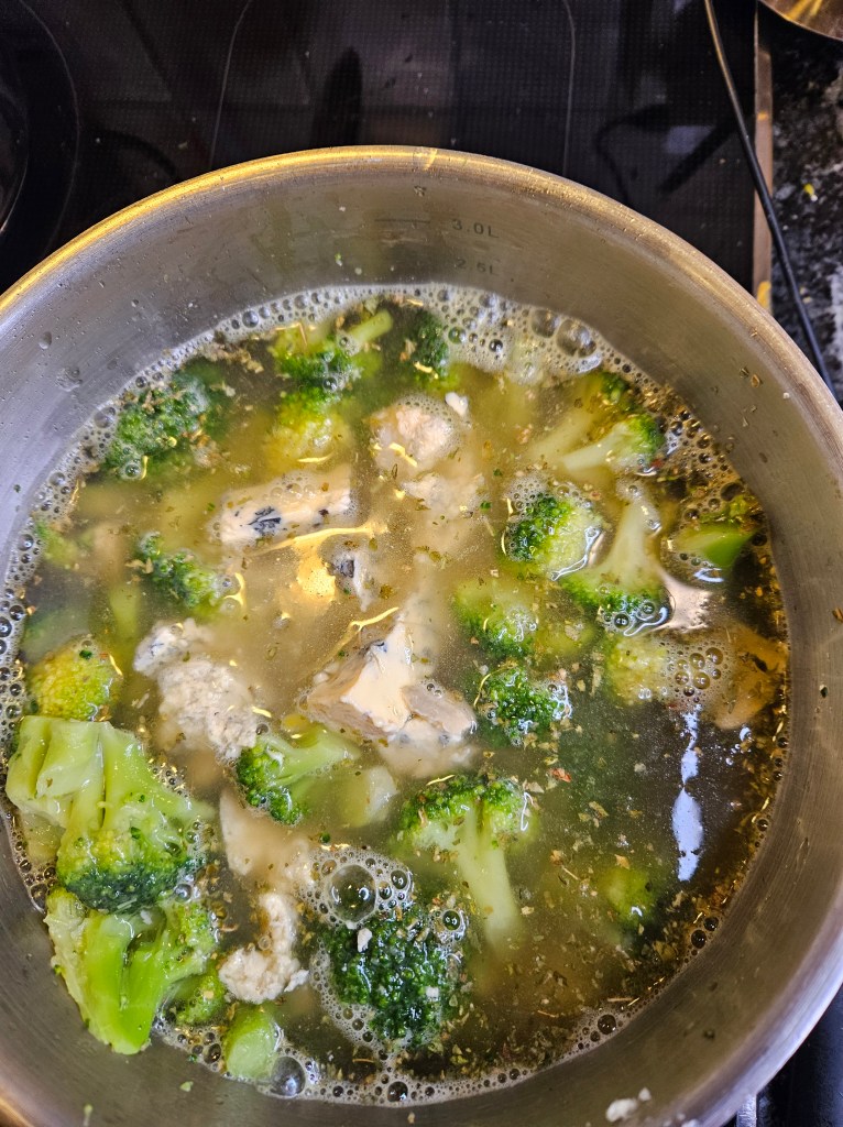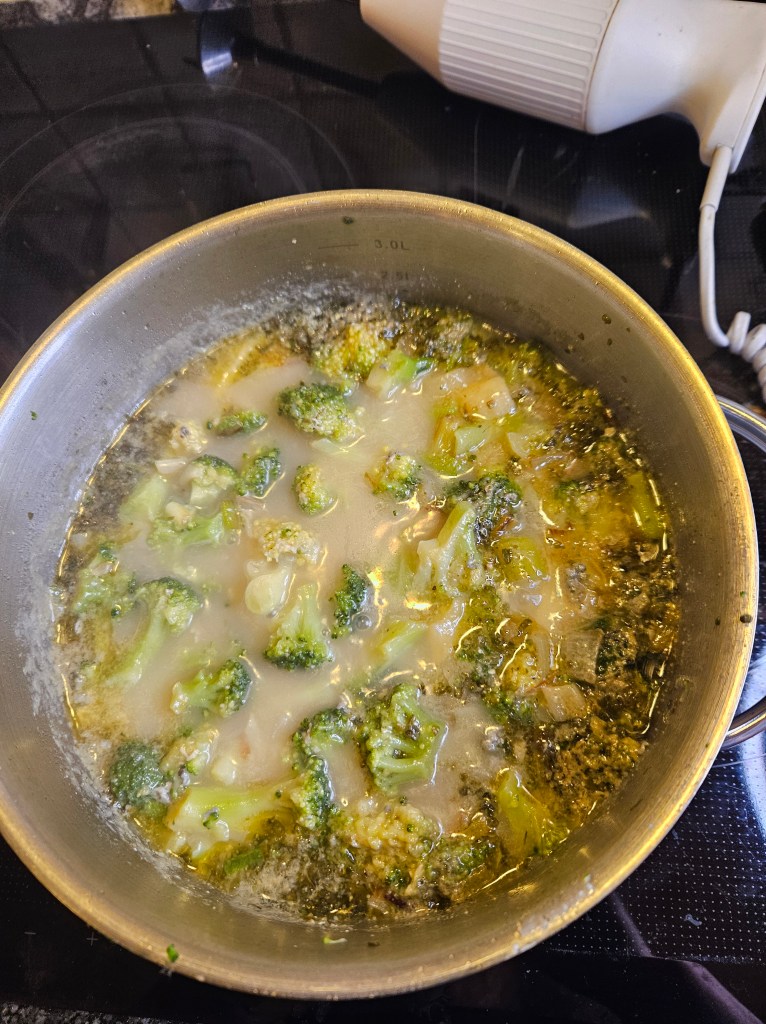 Litt nøytral olje ble varmet i en gryte. Vårløken og hakket hvitløk ble tilsatt og fikk surre litt et par minutter under røring. Timian og den frosne brokkolien fikk surre med et par minutter før varm grønnsaksbuljong og blåosten i biter, ble tilsatt sammen med litt grov pepper.