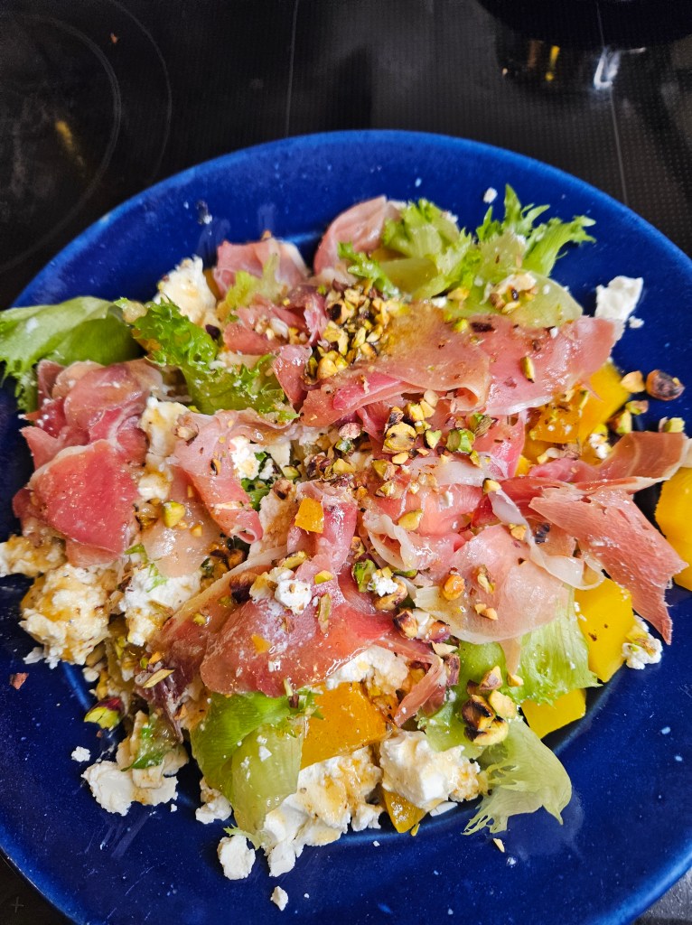 Litt av vinaigretten ble tilsatt malt koriande, honning og malt spisskummin- ca 1/2 teskje av hver. Salaten ble laget ved å blande revne flak av crispy salat (evt ruccola) med betene, hakkede nøtter (jeg brukte pistasj men valnøtter går også fint), smuldret fetaost og spekeskinke. Dressingen ble ringlet over. Rett og slett nydelig!